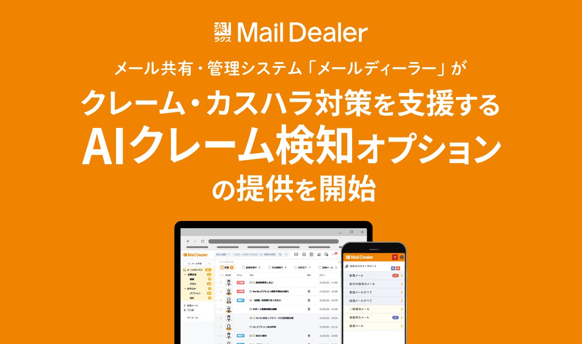 株式会社ラクス(本社:東京都渋谷区、代表取締役:中村崇則)が提供するメール共有・管理システム「メールディーラー」は、クレーム防止やカスハラ対策を支援する「AIクレーム検知」オプションの提供を開始いたします。
