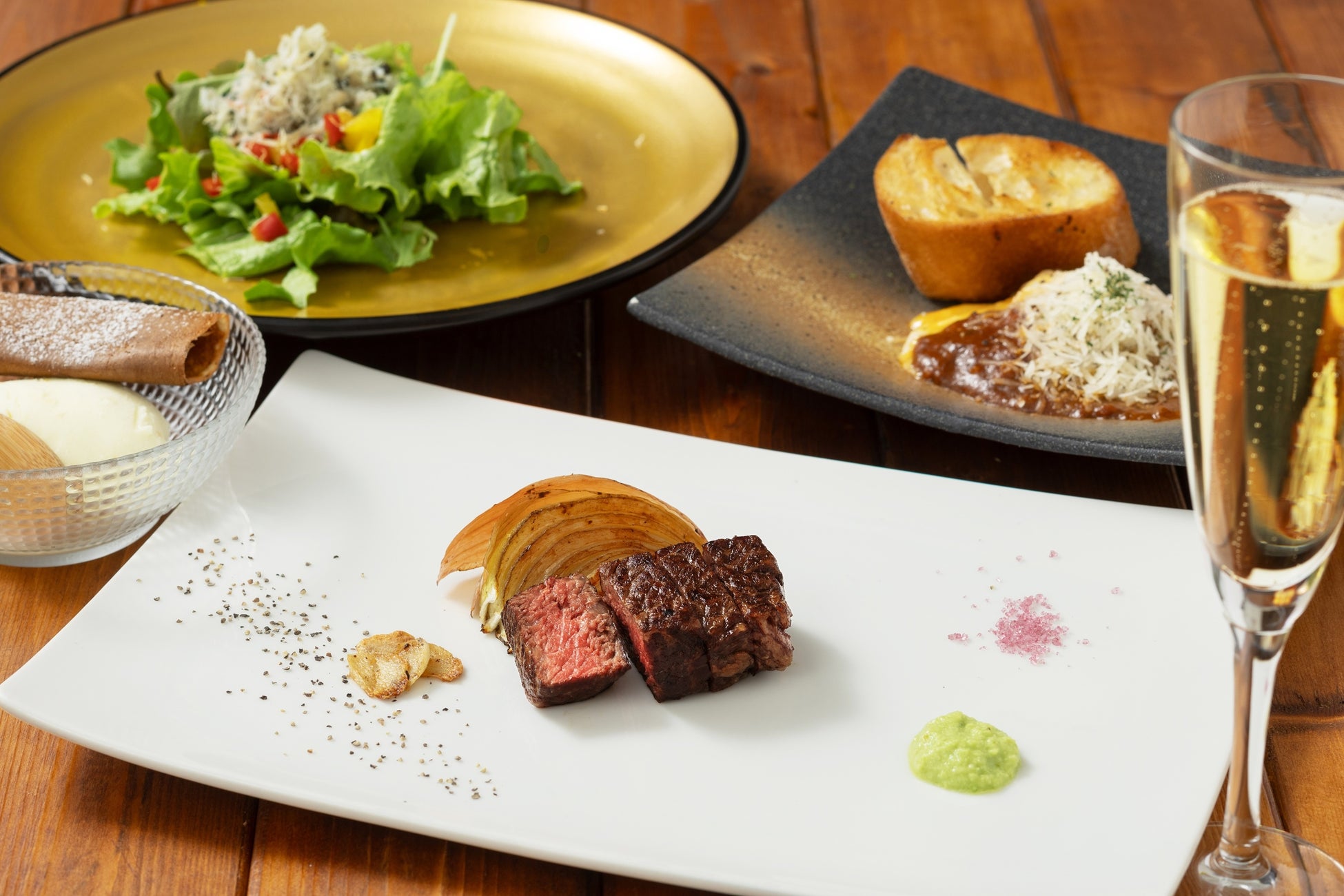 メインディッシュは厳選された国産のサーロインとフィレステーキの食べ比べです。