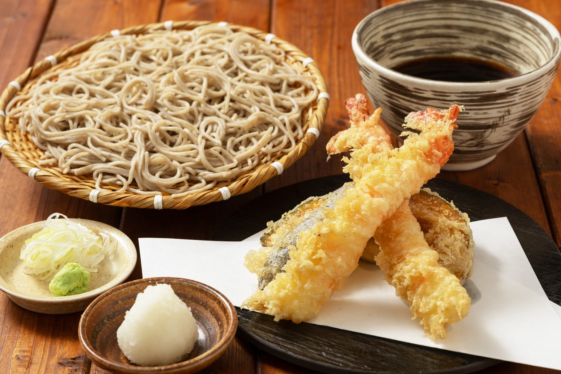 旬の野菜とぷりぷりの大海老2尾をカラっと揚げた天せいろそば。