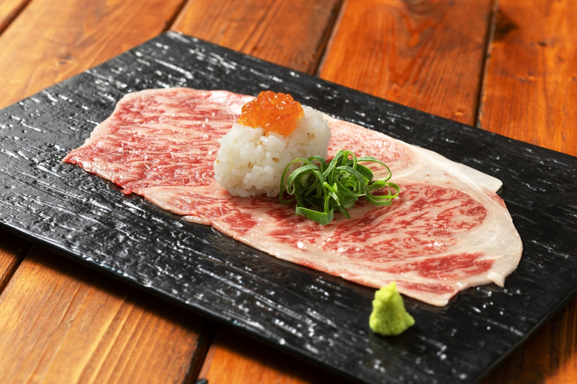 黒毛和牛のリブロースを炙っていくらをのせてご用意します。