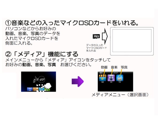 SDカードを使用する事で、SDカードに保存された動画・音楽・写真データの再生をおこなうことができます。