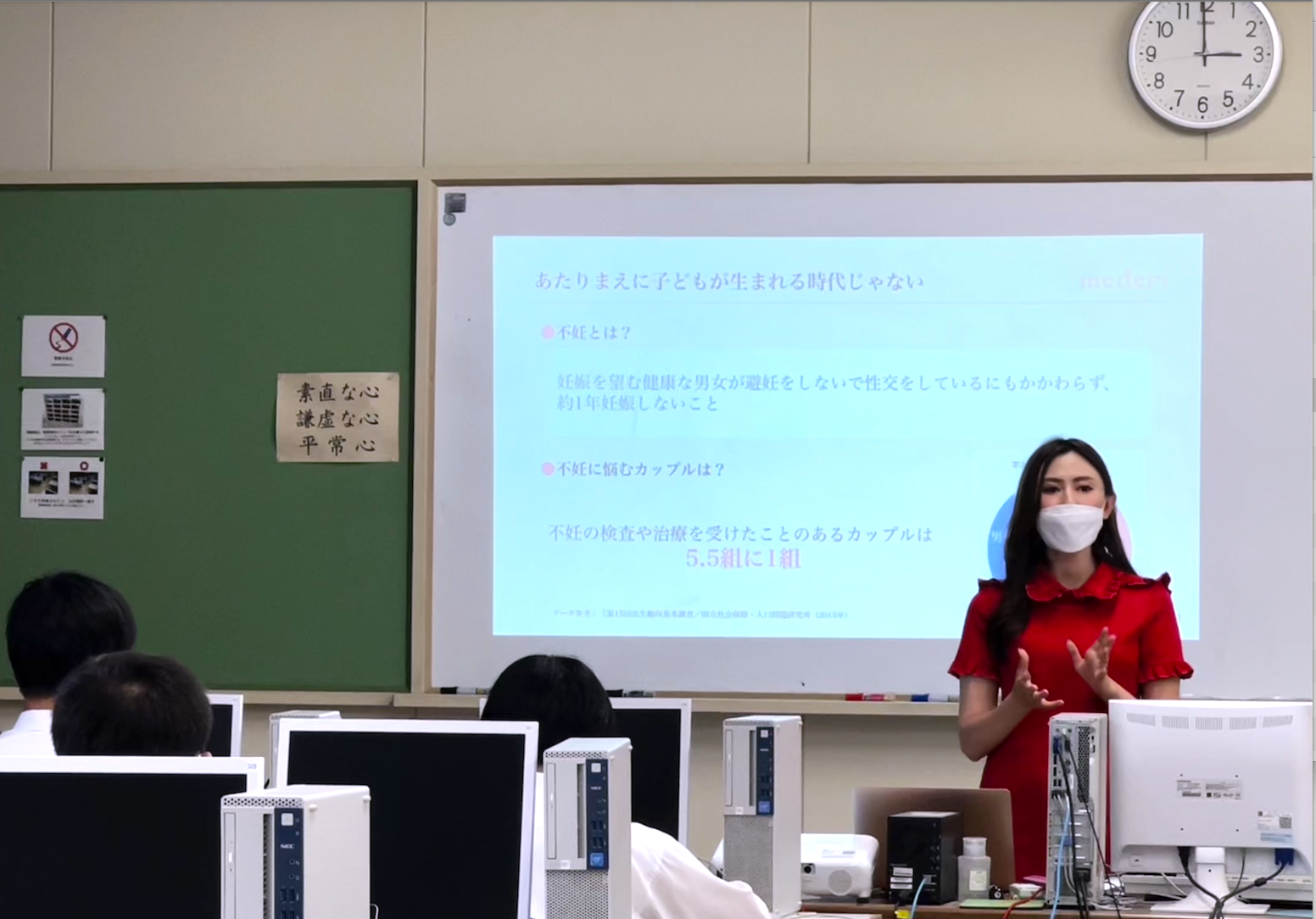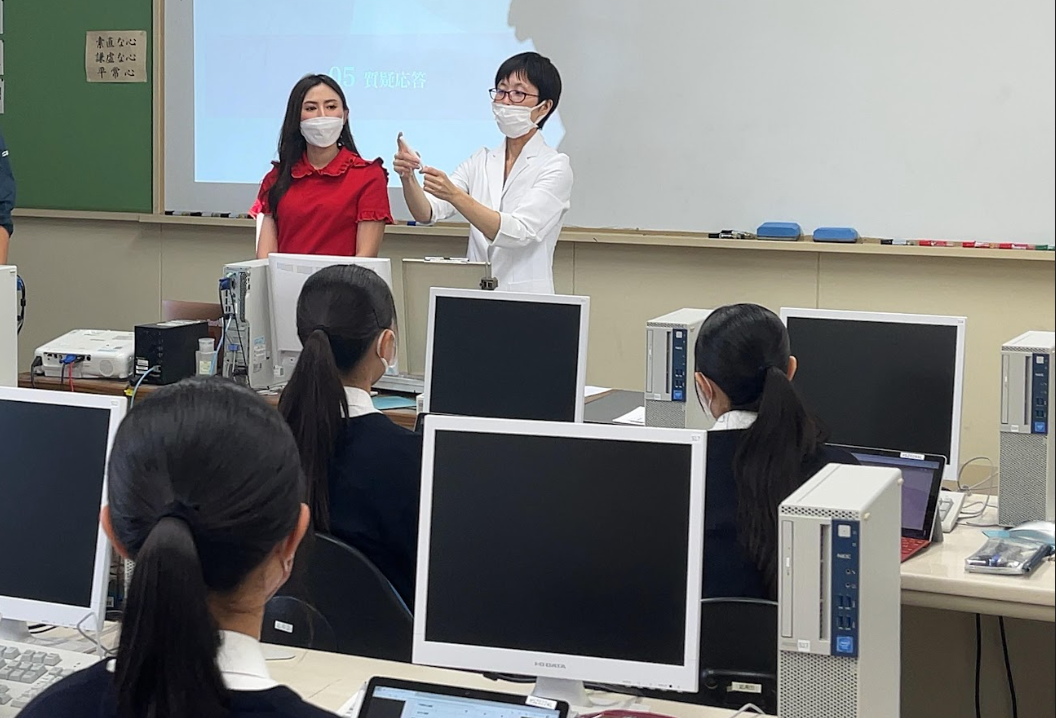 産婦人科医と代表・坂梨が、愛知県立半田商業高等学校の3年生男女15名へ出張授業