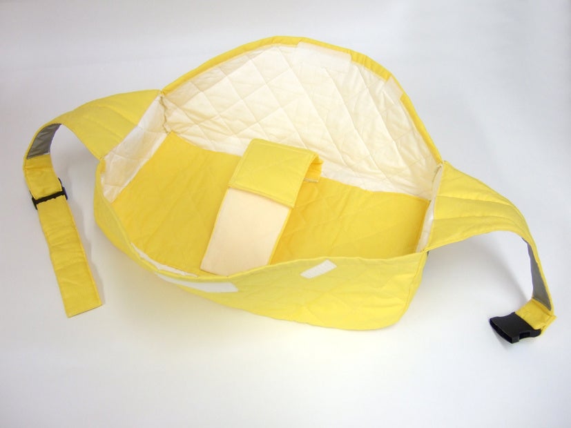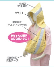 赤ちゃん用スリングの専用収納袋がお母さんの防災頭巾になっている、母と子一体型の避難具。スリングタイプは両手が完全に自由に使えるので、より安全に避難することが可能。生地には(財)日本防炎協会の防炎性能試験に合格した防炎キルティング素材を使用し、視認性を高める防炎反射テープ付き。専用収納袋の内側にはおむつを収納できるポケットがあり、スリングを使用して避難先でのおむつ交換もでき、洗濯も可能。
