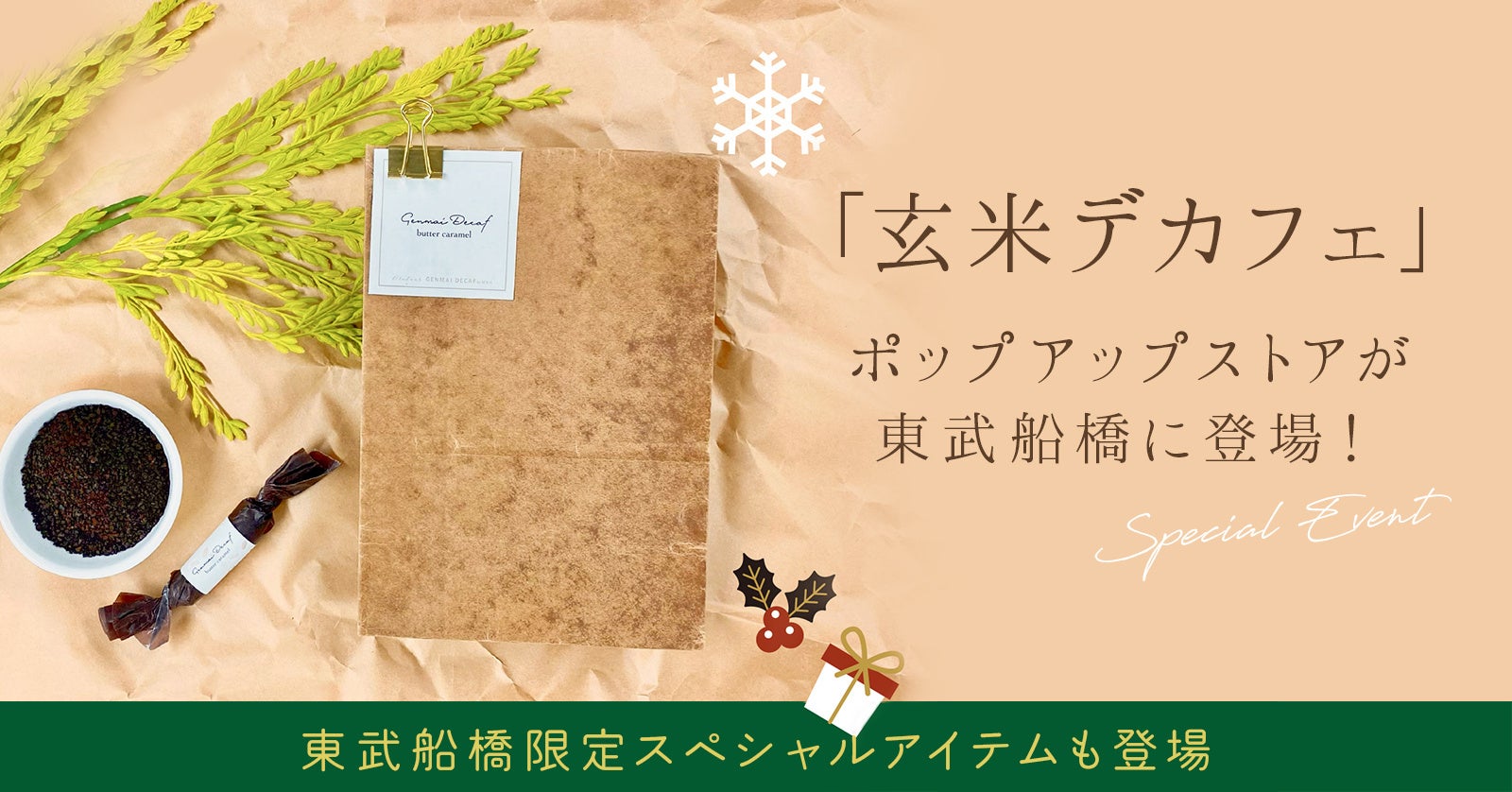 全国各地で好評の玄米デカフェのポップアップ。東武百貨店 船橋店で新商品『玄米デカフェのバターキャラメル』と、クリスマス限定商品の発売を開始します。クリスマスシーズンの贈り物にぴったりのスイーツです。