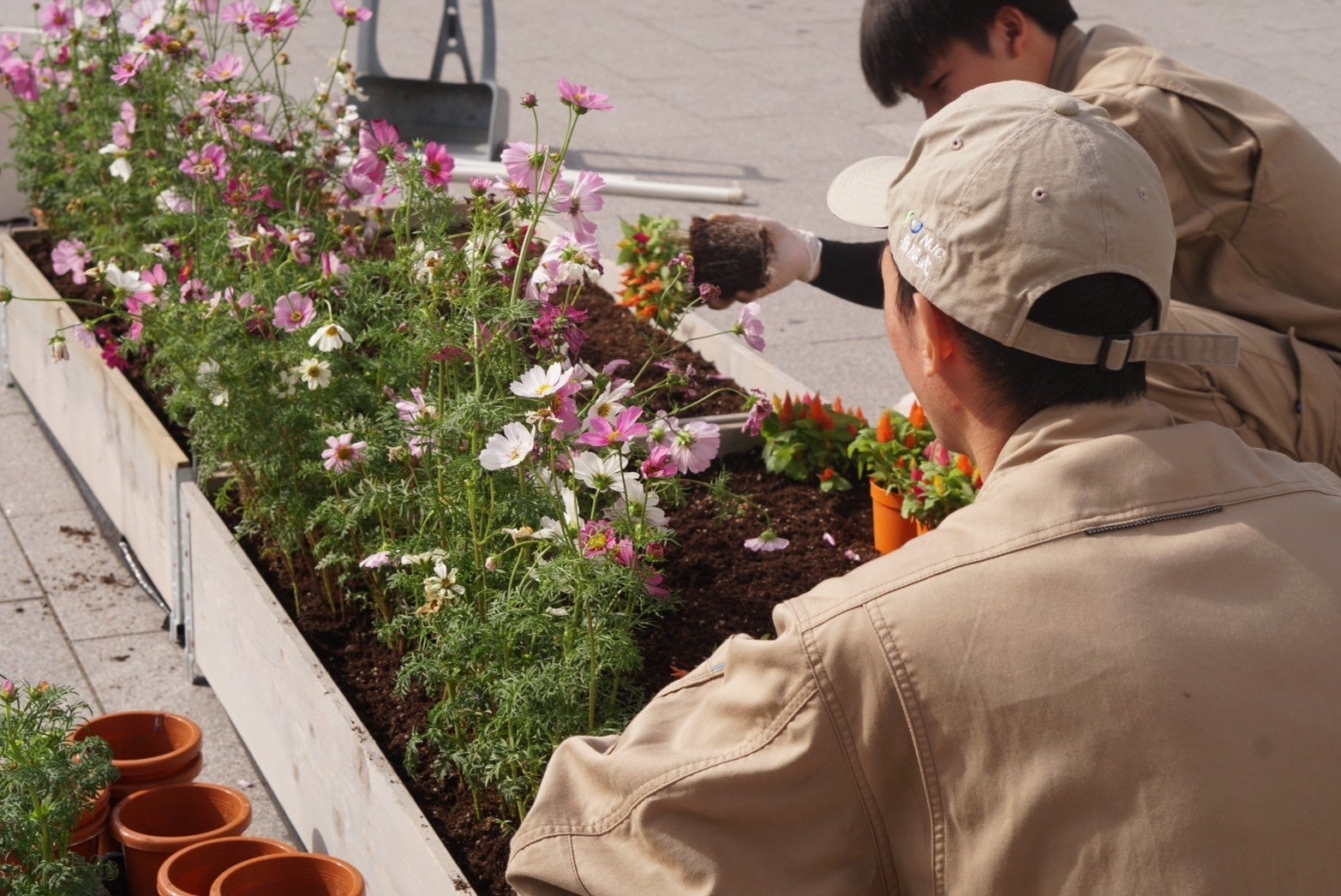 また学生には、チームごとに花壇の装飾プランを立ててもらい、苗の配置場所をチームで相談したりチーム同士が切磋琢磨して盛り上がることで、素敵な花壇が出来上がりました。