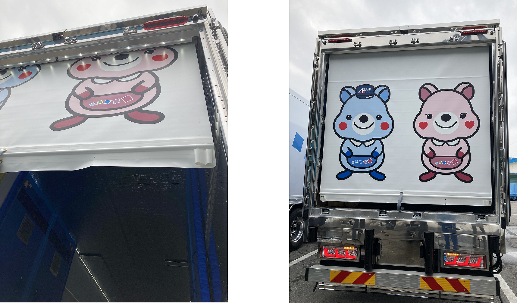 ②コンテナ内部のロールカーテンにも『アサビィ』『ももビィ』を描き、後部扉の開閉時にほっこりと笑顔になれる仕掛け ※写真4