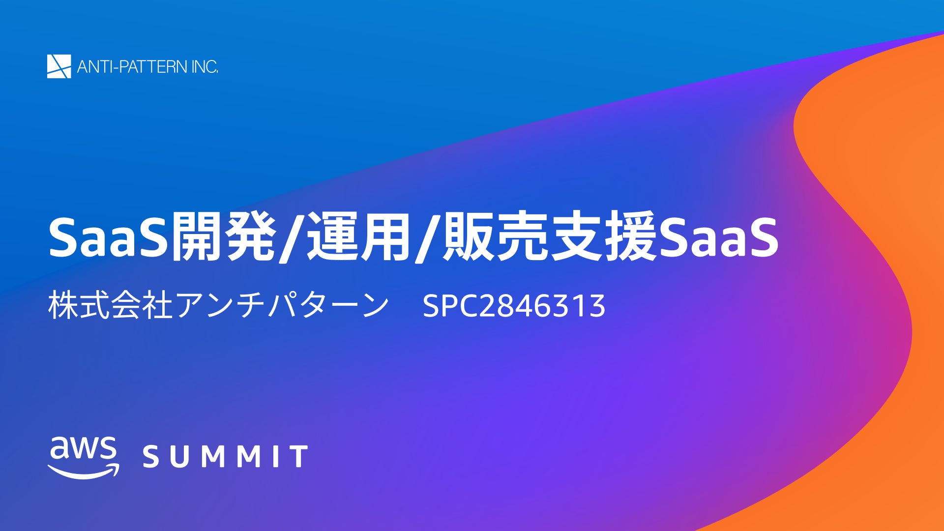 「日本のソフトウェアエンジニアを憧れの職業へ」を理念に掲げる株式会社アンチパターン(本社:東京都港区、代表取締役 小笹 佑京、以下当社)は、アマゾン ウェブ サービス ジャパン合同会社が主催する日本最大の "AWSを学ぶイベント"「 AWS Summit Japan 」に、Bronze Sponsorsとして協賛し、BtoB SaaS 開発/運用/販売を支援する「SaaSus Platform」でブース出展することをお知らせします。