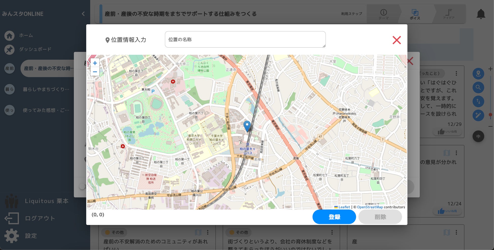 Liqlid上でアイデアを書き込む際に、マップ上にアイデアを投稿することができたり、アイデアを書き込めるマップ上に、情報表示ができたりすることで、地域情報の整理・可視化に貢献します。