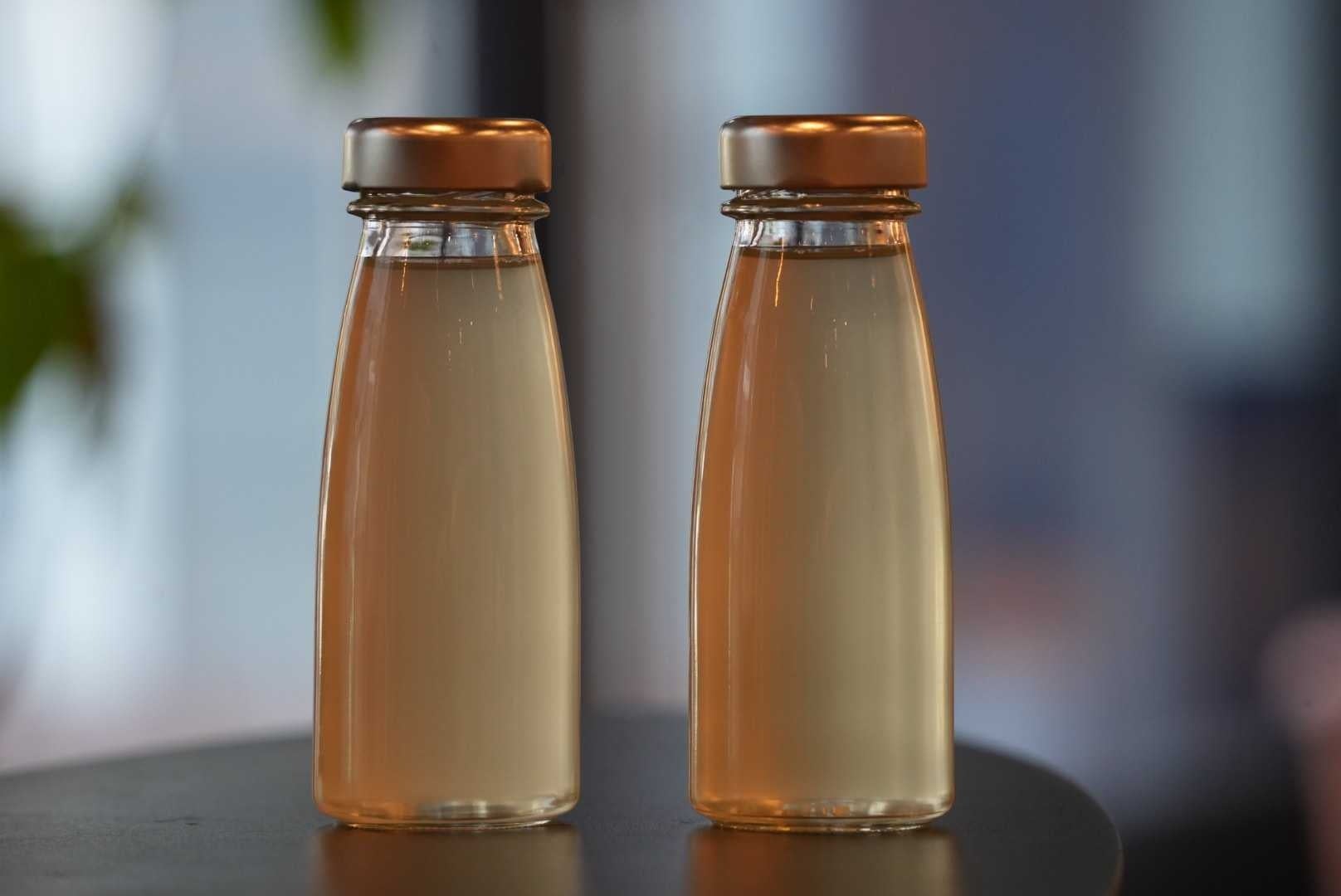 発酵の事例の応用として、日本酒の製造プロセスのうち、酵母を活性化させるプロセスにおいて、ユーグレナ粉末を用いました。10L超の醸造設備で、ユーグレナ粉末を用いるパターン(グリーン日本酒)と用いないパターン(コントロール)とで生産を行いました。