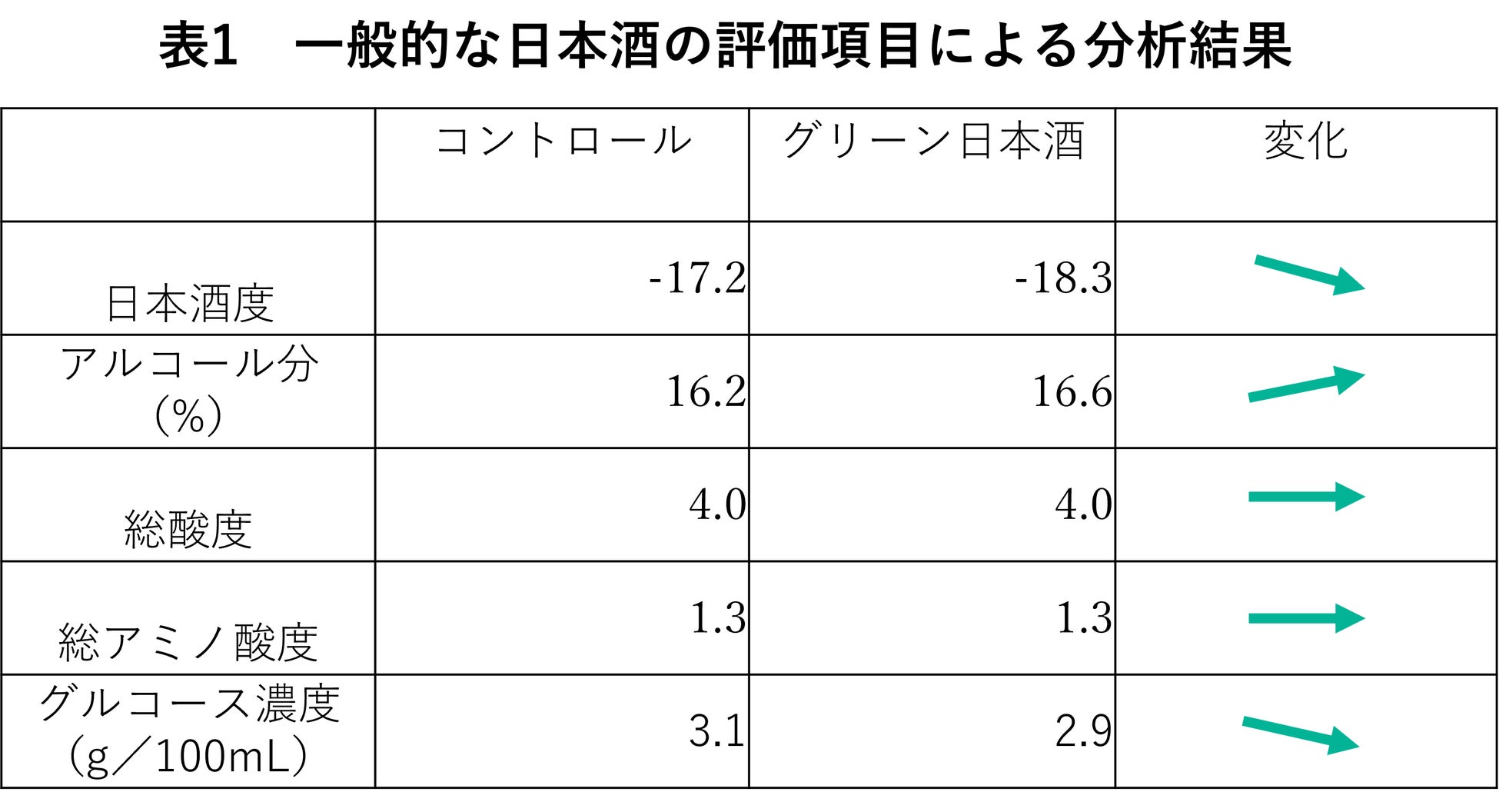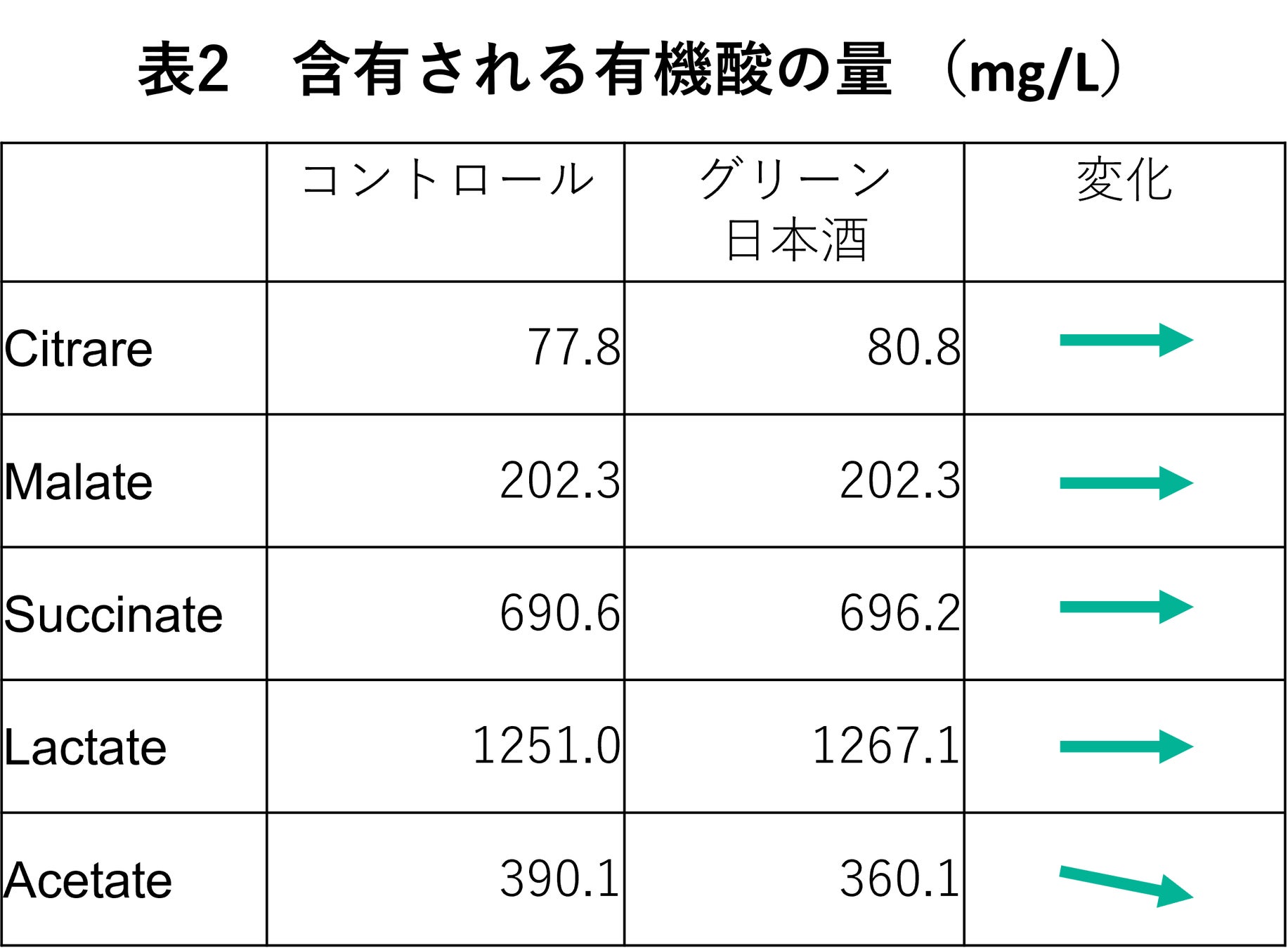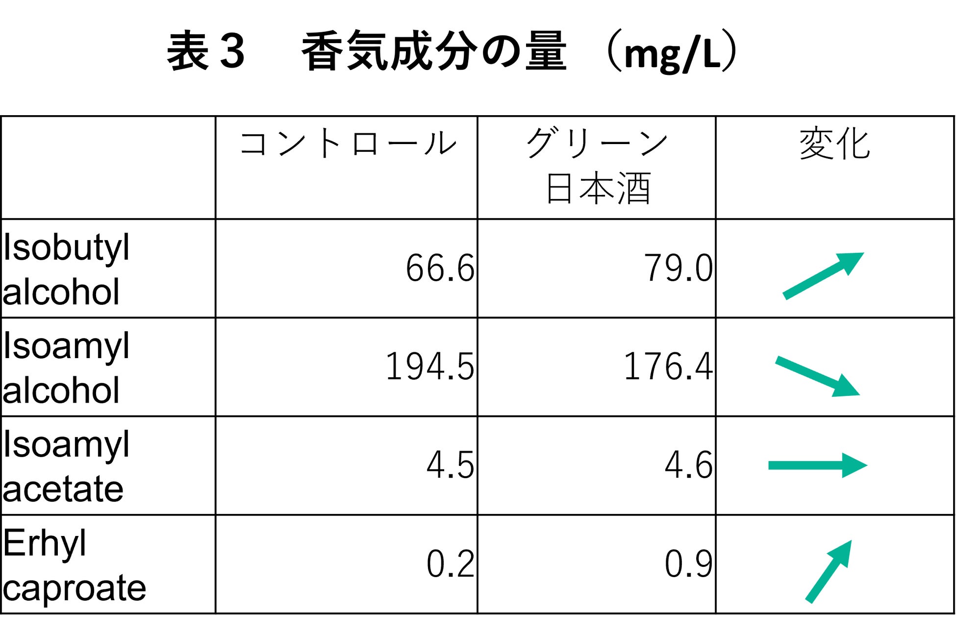 今回の製造で得られた日本酒について、どのような違いがあるか化学分析機器を用いて、コントロールと「グリーン日本酒」の成分の比較・分析を行いました(表1、表2、表3)。