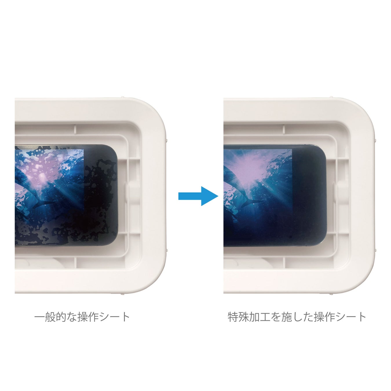 スマートフォンの出し入れがしやすいハードケースを採用。操作シートには特殊加工を施すことで、操作シートとスマートフォンの画面が密着した際に生じる気泡が入りにくく、外の光が反射しにくいためスマートフォン画面が見やすくなりストレスフリーでご使用いただけます。本体内部にリブをつけることで、ケース内で傾かずにスマートフォンを入れておくことができます。