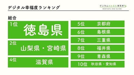 * デジタル幸福度総合ランキング1位は徳島県。続いて2位が山梨県と宮崎県。