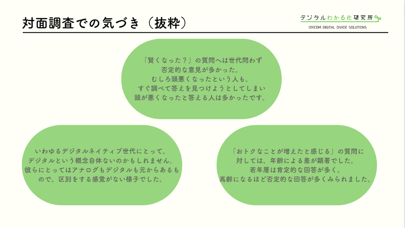 デジタルデバイドの影響を加味した対面調査にこだわった結果、量的な調査データには残らない、定性的な気づきを得ることができました。中でも世代間での「デジタル」の定義の違いや回答中の各設問への意識差などを肌で感じることができました。詳細は11月公開予定の後編記事にてご紹介します。