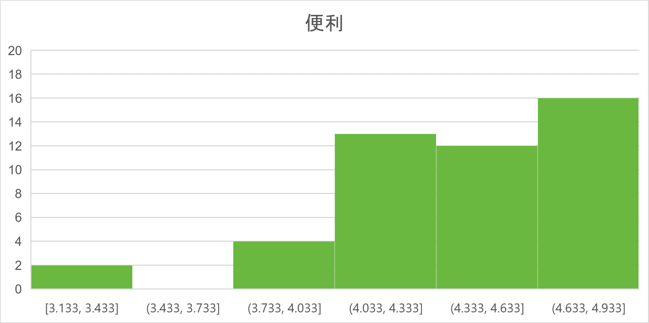 5因子について、都道府県間の単純な分散を抽出したところ、「便利」の因子が最も高い分散が得られました。デジタルによって生活が便利になる幸福度合いは、地域差が大きく影響しているのではないかと考えられます。デジタルがもたらす便利さには場所によらないものが多い一方で、決済サービスでの店舗対応や基地局の対応域のような前提としてのインフラが各地域単位に備わっている必要があるものが一定数存在します。各種デジタルサービスの普及度と合わせて比較することで、新たな課題に気づく一助となるかもしれません。一方で「楽しく過ごせる時間」は最も分散が小さく、地域差による影響があまりないことがうかがえます。詳細は5段階評価の回答数分布を整理したヒストグラムを参照ください。