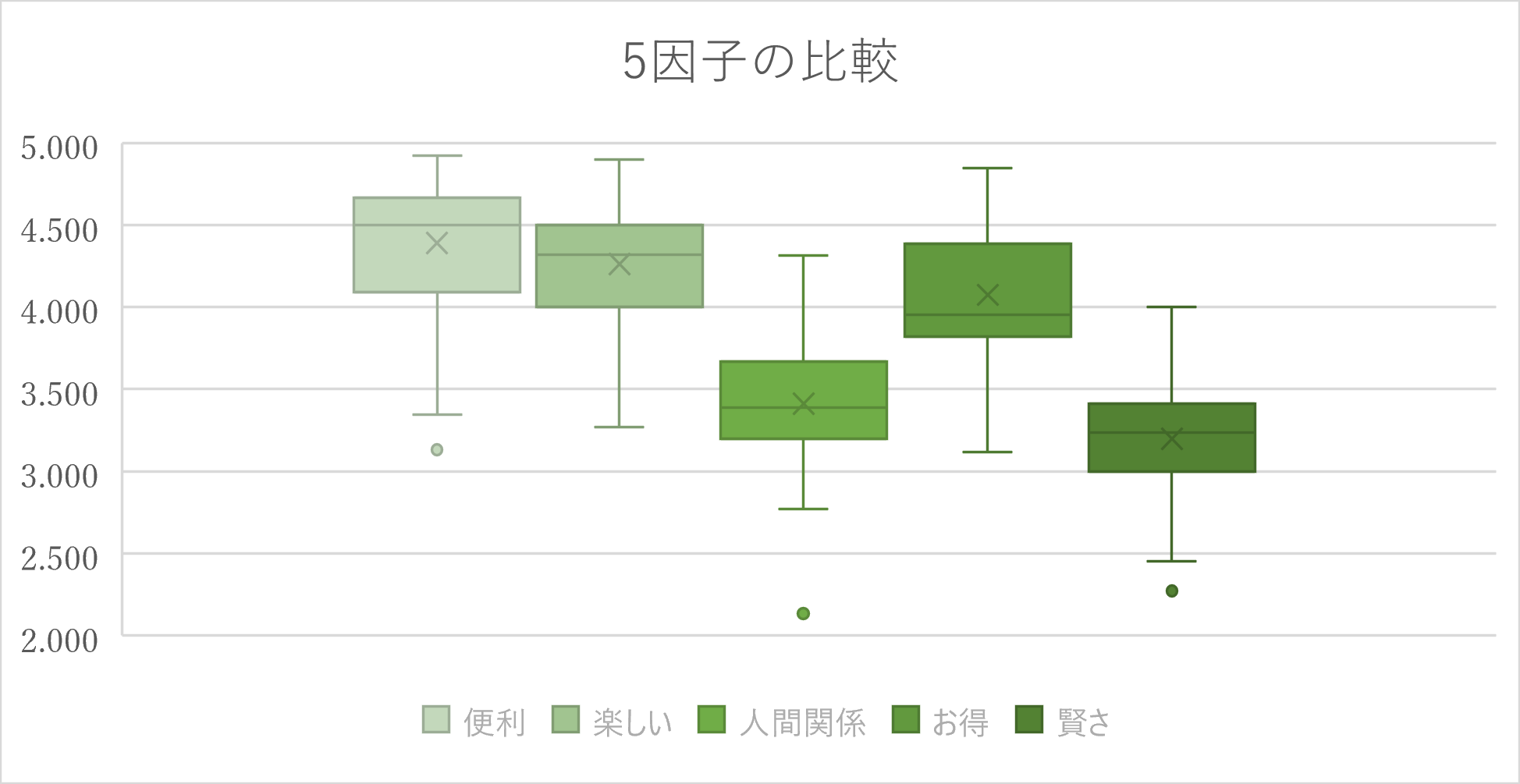 「賢さ」の因子が相対的に低いレンジを推移する結果となりました。回答者の口からは「自分で考える習慣がなくなった」などのスマホ頼りな生活に対して不満感を持つ声が散見されました。回答者の話からは自分の頭で考えること=賢いという等式が地域を問わず根付いている様子が垣間見えました。特に日本では苦労することが美徳とされる傾向があることからか、己の頭一つで考えないことで、賢さを損なっていると感じるようでした。この美徳は、もしかするとデジタルデバイドを生む原因を含んでいるのかもしれません。詳細は下記箱ひげ図をご覧ください。