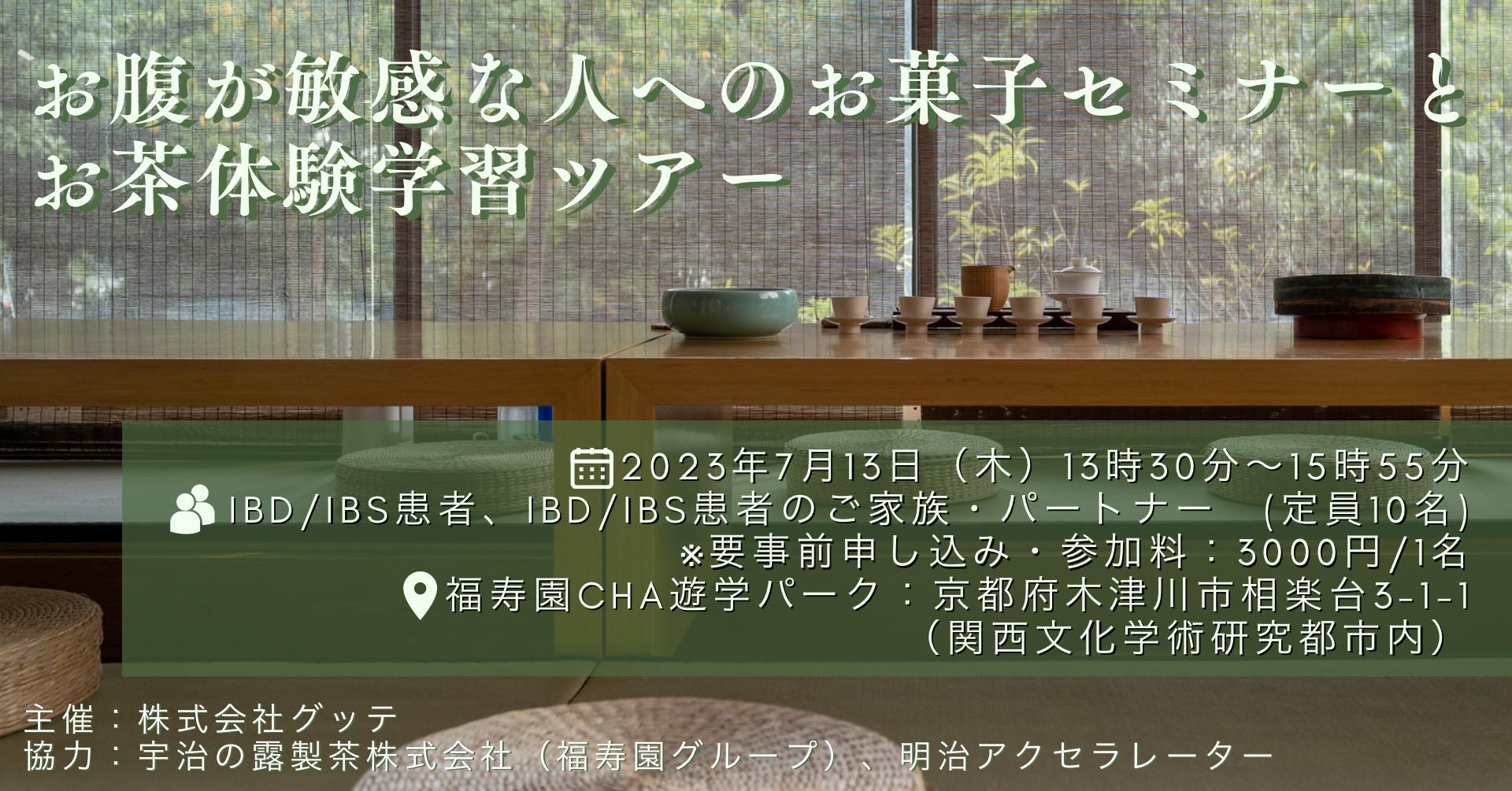 グッテはIBDやIBS患者さんの食に関する課題解決を目的として明治アクセラレーター第2期の中でソリューション開発に取り組んでいます。そのような中で、今回、宇治の露製茶株式会社(福寿園グループ)、明治アクセラレーターの協力の元、IBD、IBS患者さんやご家族らが、お茶に関する体験を通して食の喜びや楽しみを感じ、学びを得ることを目的として「お腹が敏感な人へのお菓子セミナーとお茶体験学習ツアー」を開催することとなりました。