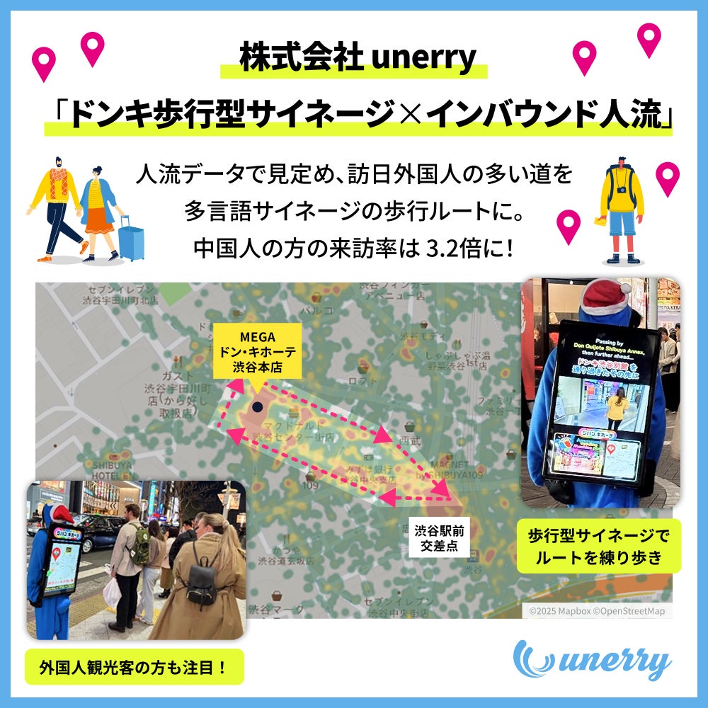 ドンキ歩行型サイネージプロジェクトは、ドン・キホーテ、unerry、メーカーが協働したインバウンド集客施策です。