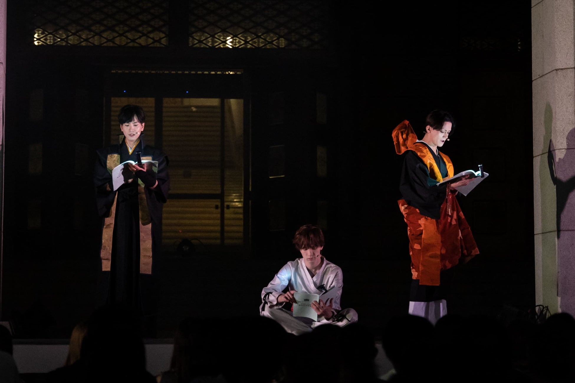 屋外の、厳かな東京国立博物館の入口の前に座って待っている……という状況がまず特殊で、固唾を飲んで開演を待っていると、どこからか鈴虫の鳴く声が聞こえてきます。これは自然の音なのか、冒頭から不思議な没入感がありました。
