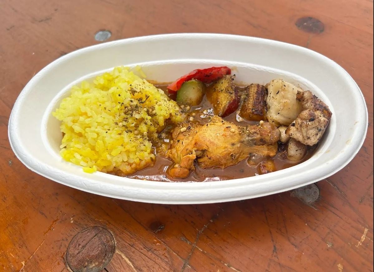 KBCテレビ『シリタカ!』からみなさまに感謝をこめて、水炊きの名店「博多華味鳥」とコラボレーションしたスペシャルメニューを期間限定で販売。鶏手羽が1本入ったスパイシーな水炊きスープカレーに、野菜や鶏肉をごろっと乗せた「鶏だし香るシリタカレー」です。