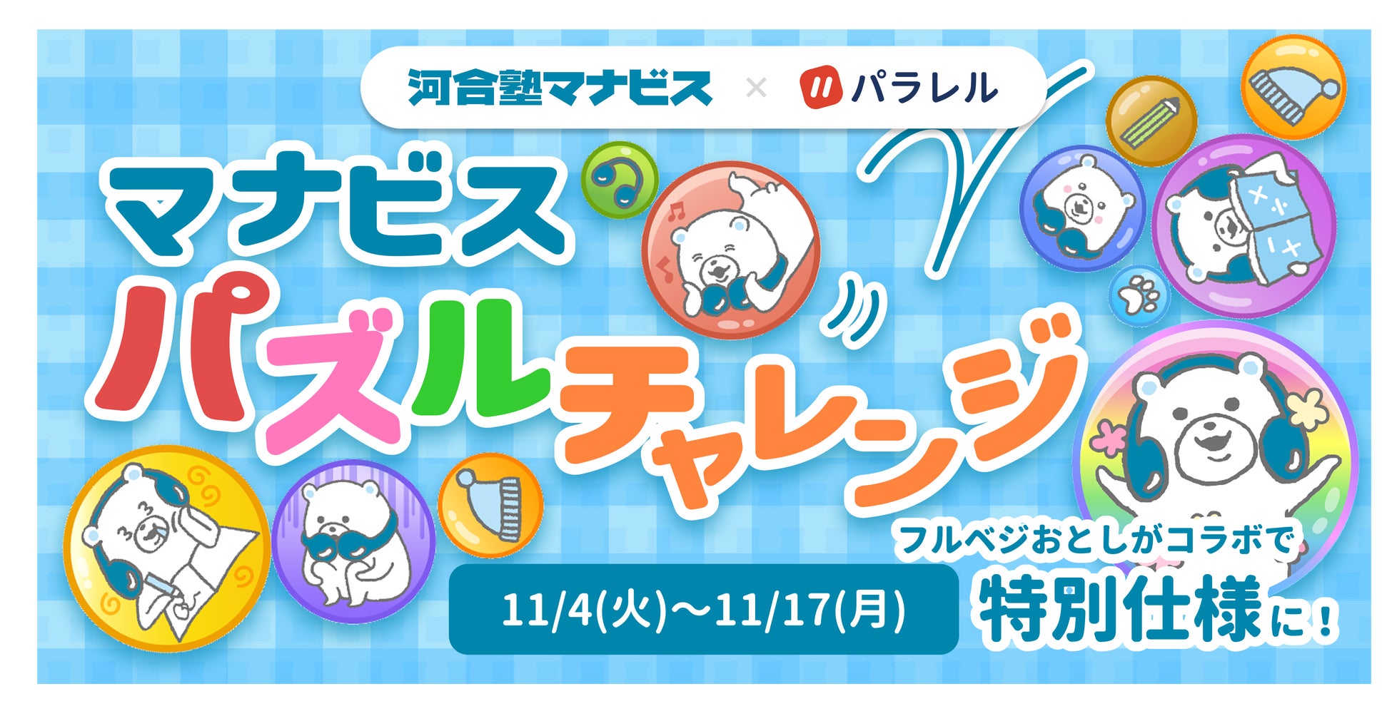 友達と遊べるたまり場アプリ「パラレル」(運営会社:パラレル株式会社、所在地:東京都港区、代表取締役:青木穣・歳原大輝)は、「河合塾マナビス」(運営会社:株式会社河合塾マナビス、所在地:東京都千代田区、代表取締役:飯塚 拓)とのコラボレーションイベント「マナビスパズルチャレンジ」を2025年11月4日(火)から11月17日(月)まで開催します。