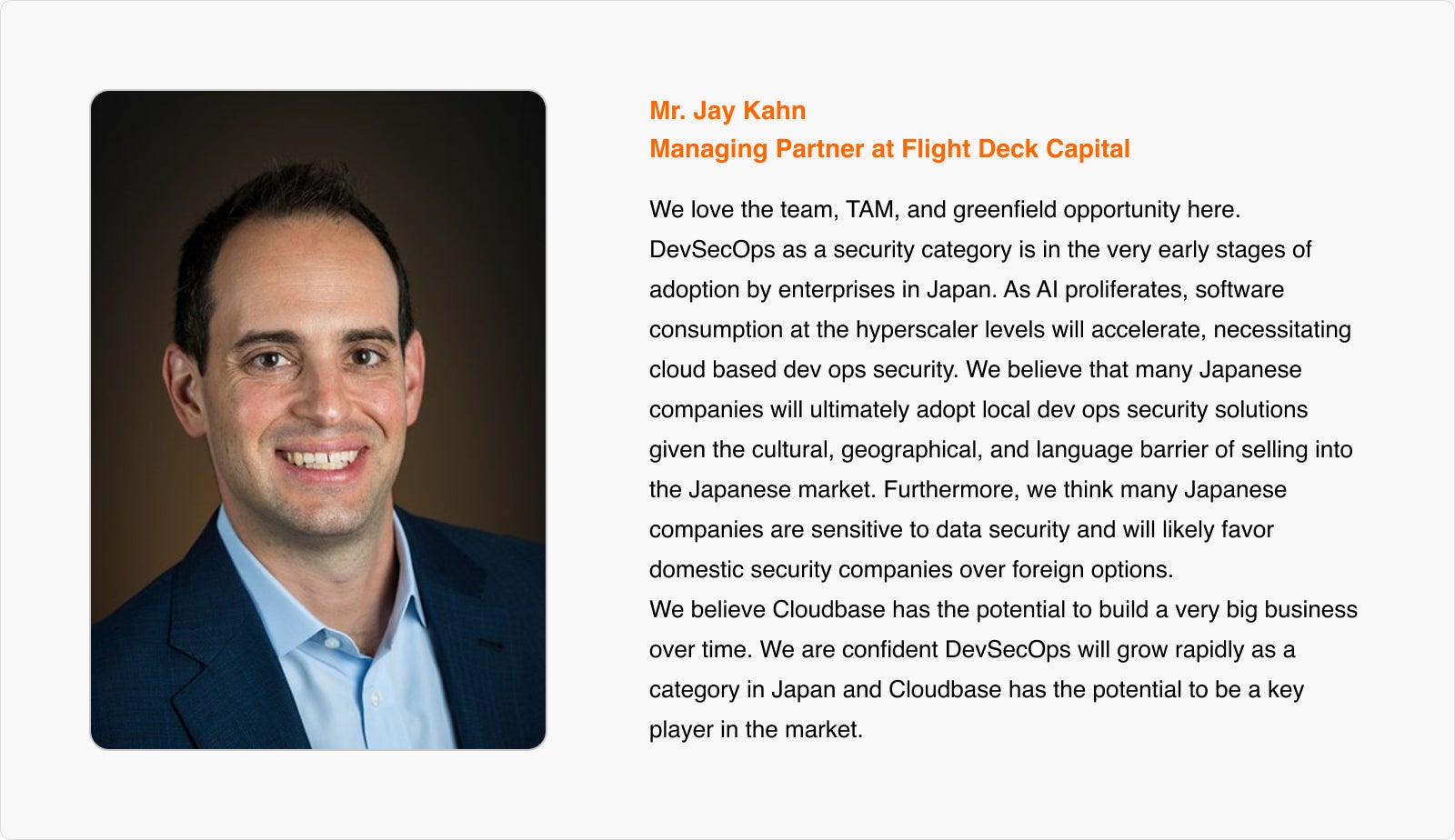 Cloudbaseは今後、非常に大きなビジネスを作り出す潜在能力を持っていると信じています。私たちは、日本でDevSecOpsが1つの領域として急成長すると確信しており、Cloudbaseはこの市場で重要なプレーヤーになる可能性を秘めていると考えています。