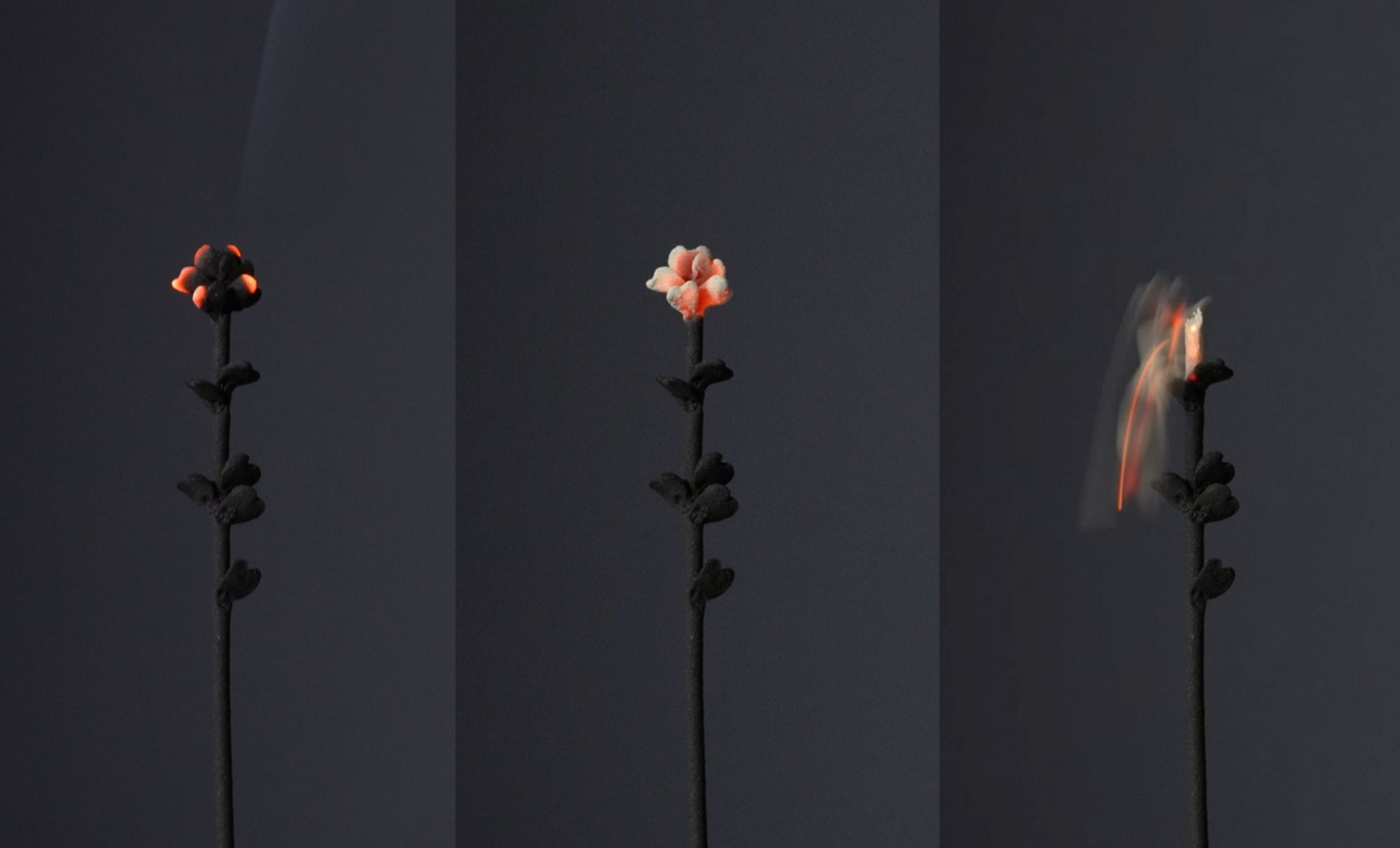 中国・杭州に生まれ、高校卒業後に日本に渡り多摩美術大学や武蔵野美術大学を卒業したKaining He は、プロダクトからグラフィックまで幅広い分野を横断し、素材の物質性への観察を出発点に、ものづくりと人文学とのつながりを探求。詩的な世界観をベースにした創作活動を行っています。デザイン事務所での勤務を経てロンドン芸術大学へ留学後、現在は中国と日本の両方で活動しています。DESIGNART TOKYOで発表する「時間の贈り物(The Present of Time)」は、乾燥前は粘土のように柔らかく、自由に形を変えることができる「お香」の特性を活かして、造形や原料が燃焼に与える影響を探求し、お香が灰へと変わる過程をデザインに取り入れています。蕾の形をしたお香は灯すと早春の梅のように艶やかな光を放ち、葉の形をしたお香は秋の紅葉のように鮮やかに燃え、やがて枯れていく。春には花が咲き誇り、冬には静かに雪が降り積もる。「「今、この瞬間」に意識を向ければ、「Present」は「今」という時間からの「贈り物」でもある」という禅の思想と深く結びついたお香の体験を提供します。