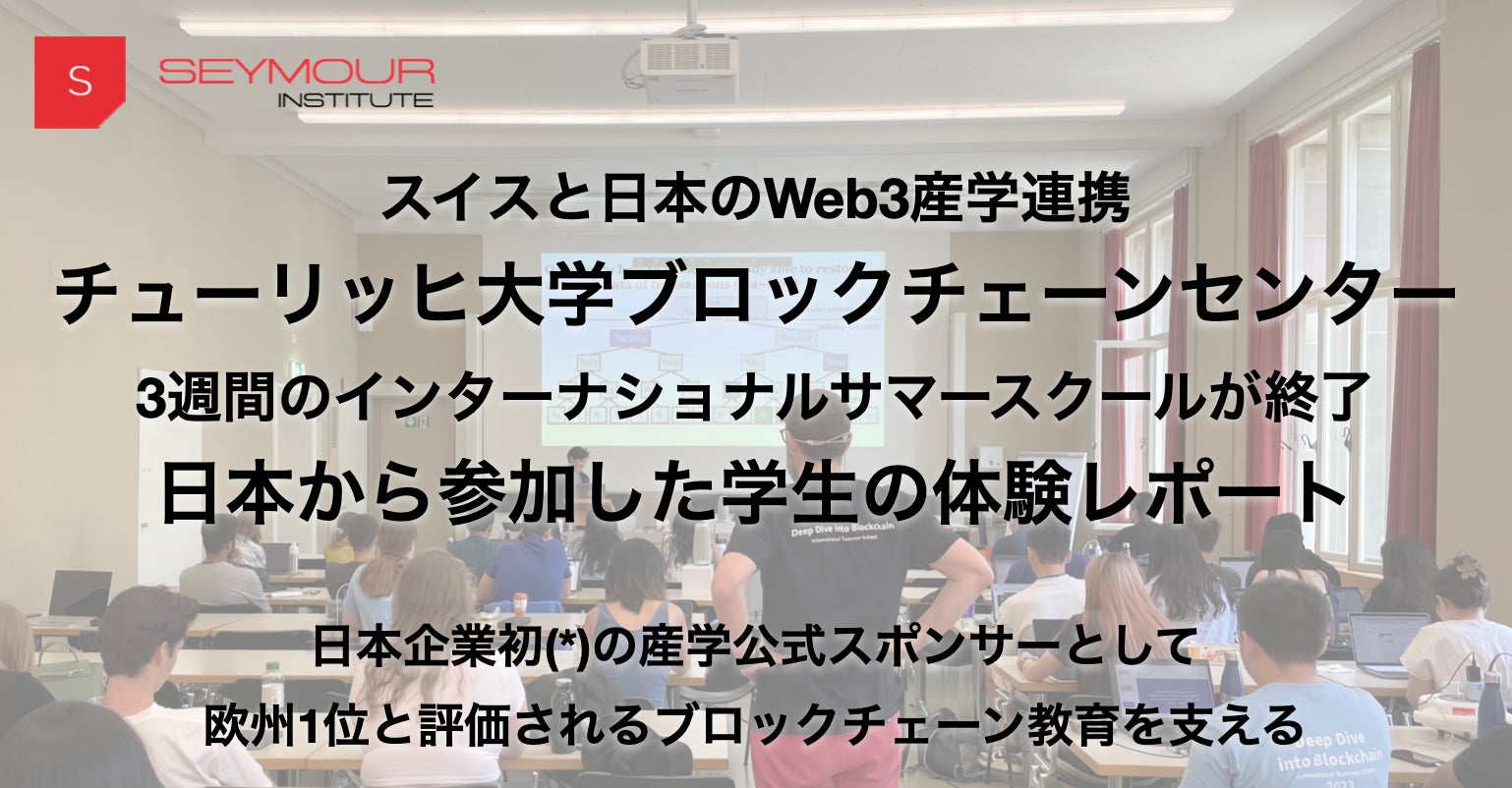 チューリッヒ大学ブロックチェーンセンターのTessone教授とSEYMOURは、同センターの設立当初からスイスと日本のブロックチェーンにおける産学連携に向けた取り組みで協力してきました。2020年から始まったインターナショナル・サマースクール「Deep Dive into Blockchain(ブロックチェーンを探求する)」に、SEYMOURのスイスで学ぶ教育助成プログラムより、日本から計6名の学生(2023年の学生を含む;山口大学工学部、大阪大学、同志社大学、国際教養大学)たちに助成金を提供してきました。チューリッヒ大学はブロックチェーン教育に取り組む教育機関として、欧州で1位、世界では3位に評価されています*1。