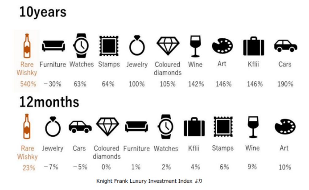 他市場と比較すると、ウイスキーカスクは、かなり高いリターン率を得ることが出来る投資商品であることが分かります。