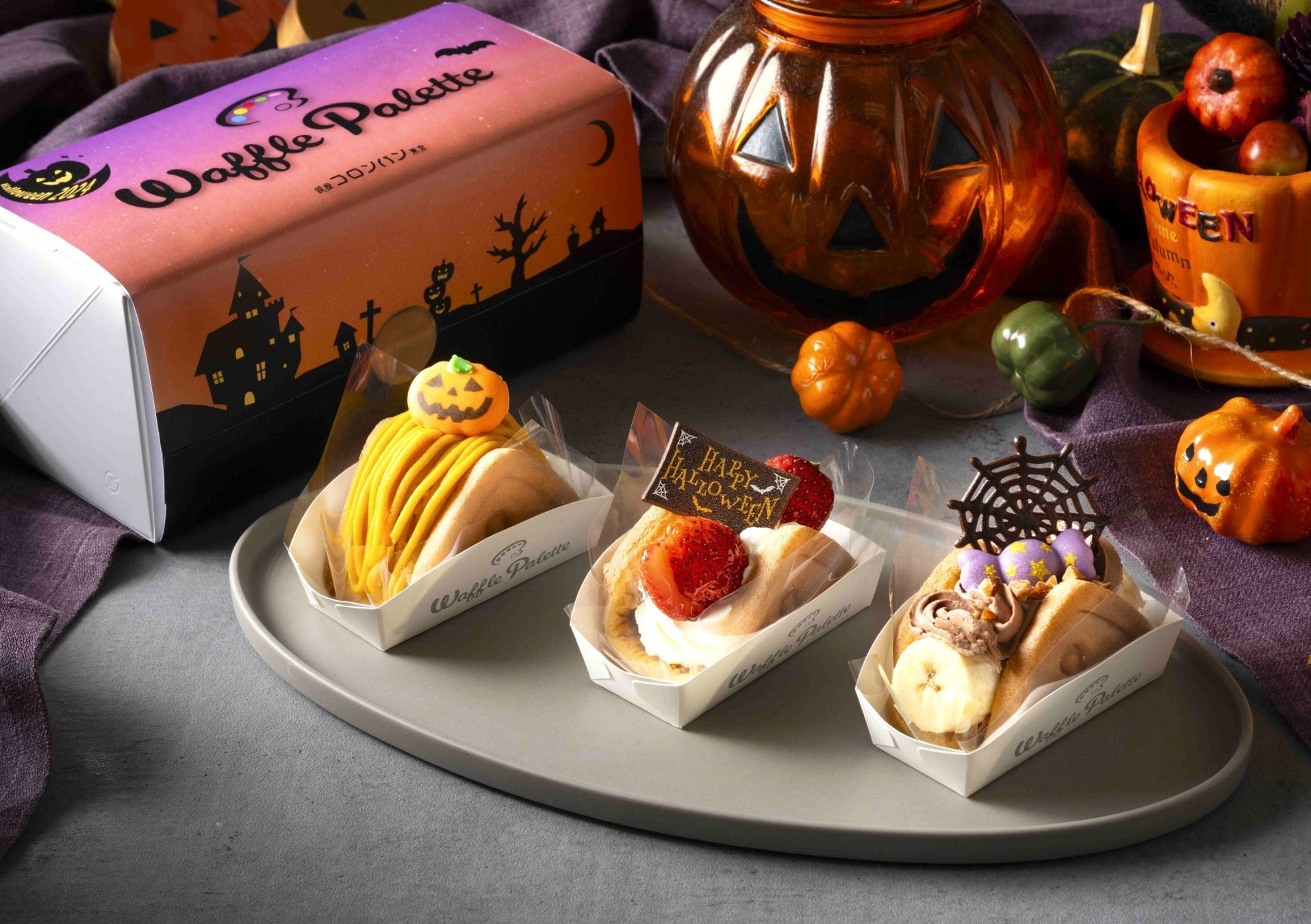 北海道産えびすかぼちゃと栗のペーストをブレンドしたクリームの「パンプキン」、ふわふわしっとりのワッフル生地で生クリームを包んだ「苺」、ガナッシュクリームとバナナの相性が良い「チョコバナナ」。ハロウィンを盛り上げる、3種類のワッフルアソートです。10月25日~31日の7日間限定販売です。