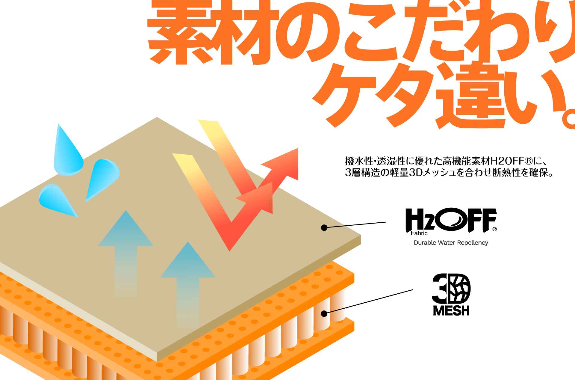 アウトドアウェアでも使用される撥水性・透湿性に優れた高機能素材「H2OFF®︎」と、速乾性に優れた「軽量3Dメッシュ」を組み合わせ断熱性も確保。過酷なサウナ内でも快適な使用感を提供。
