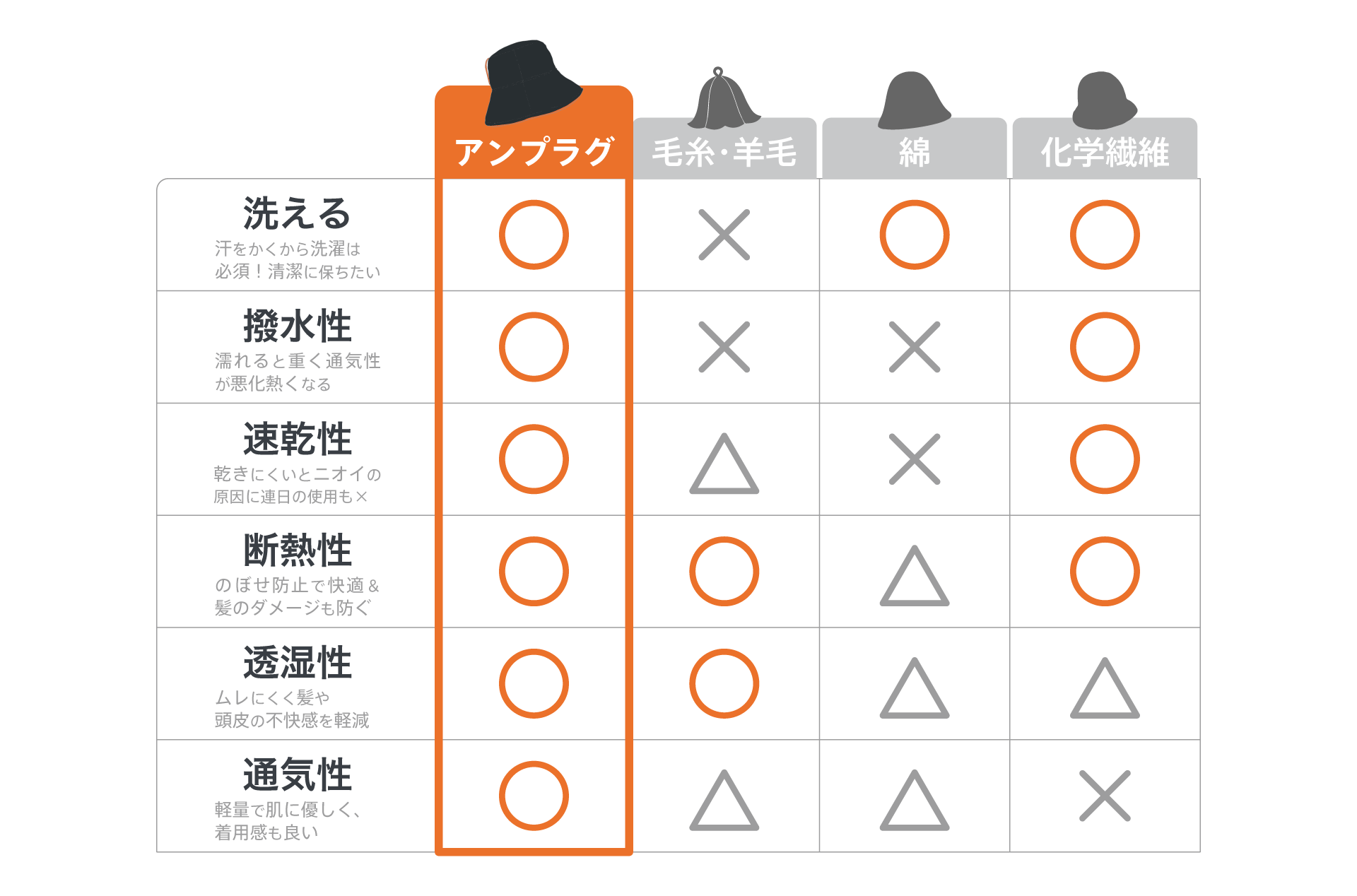 ・断熱性に優れた高機能素材 Unplugのサウナハットは、通気性と断熱性を確保し、熱や乾燥ダメージを軽減。