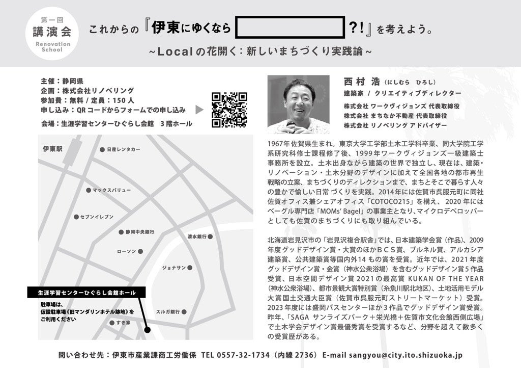 全国各地で、空き店舗・空き家や地域資源(人・歴史・文化)を活かして、エリア価値を上げていく「リノベーションまちづくり」が進んでいます。伊東市でも本年度からこの取り組みがスタート。今回の講演会は、その具体的な実践事例を学ぶ講演会です。これからの時代は、どうまちを見立て、どんなアクションをすることが必要なのか。全国各地でまちづくりを実施しているワークヴィジョンズの西村浩さんと共に、伊東の未来を考えよう。ぜひご参加ください。