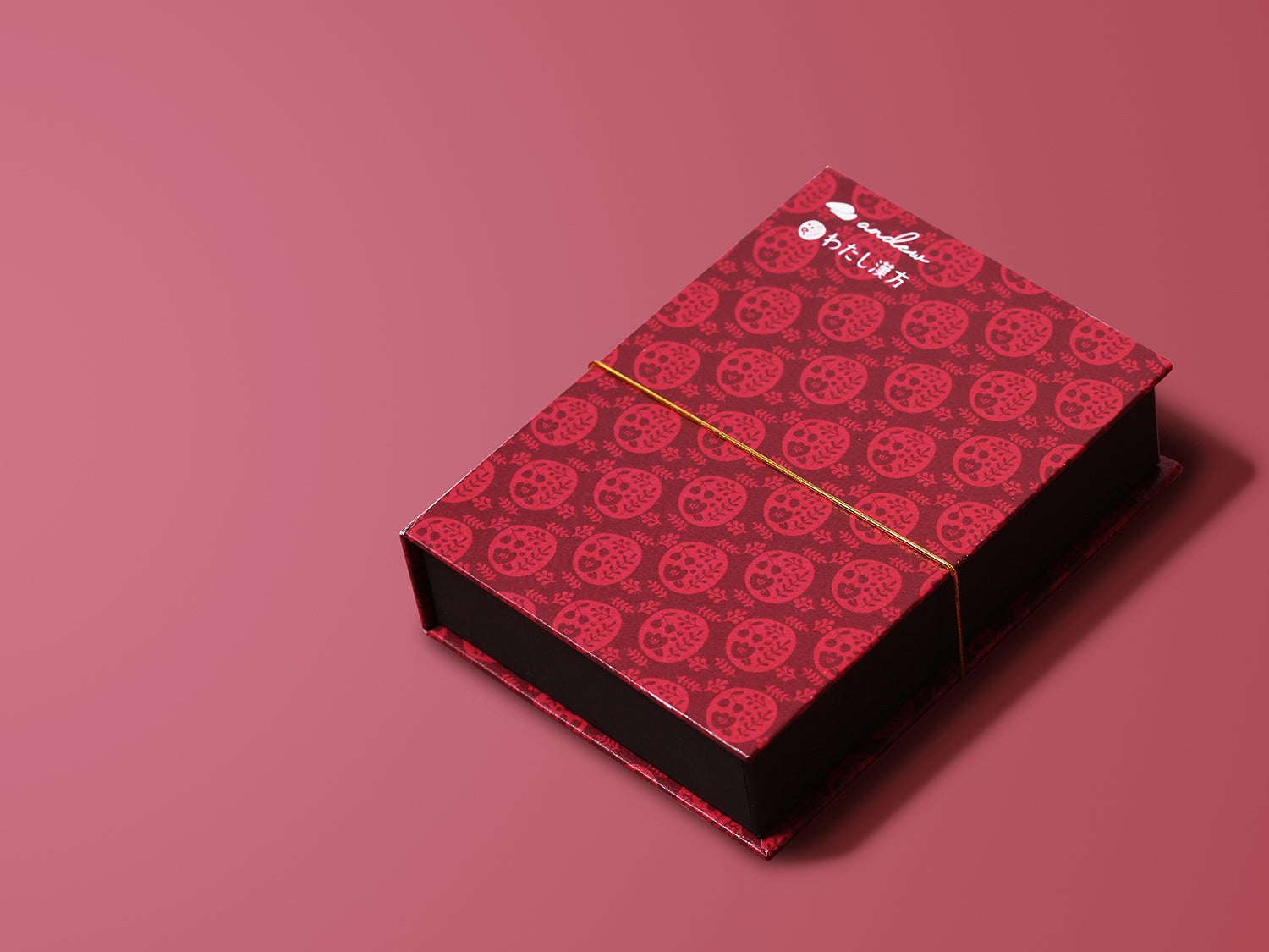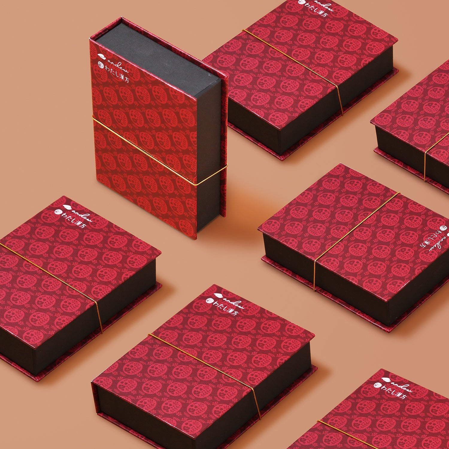 「5つの体質にチョコレートに出会う」というテーマでデザインを行いました。まるで本を開いて自分に向き合っているような時間をイメージしました。また箱の形の「本」というキーワードには漢方の専門性や学問という要素を盛り込んでいます。配色は漢方と親和性の高い赤色をメインに部分的に金を添えて高級感を表現。