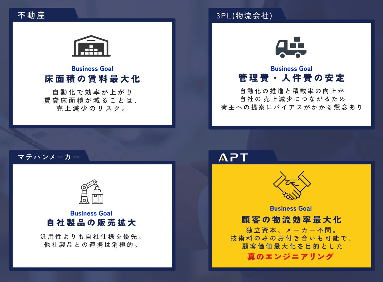 一概には言えないが、各々の事業ゴールと「物流の効率化」は相反するテーマを内包しており、真に顧客目線に立った提案となりづらいケースもあるのではと感じ、第三者・中立の立場でのAPTとして、ご相談を受けることがこれまで多々存在していた。