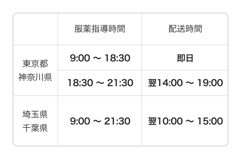 12/28(土)〜1/5(日)は東京都・神奈川県でのお薬の即日配送の対応時間を以下の通り拡大いたします。18時30分までに服薬指導を終えた場合、当日中にお薬のお届けが可能です。