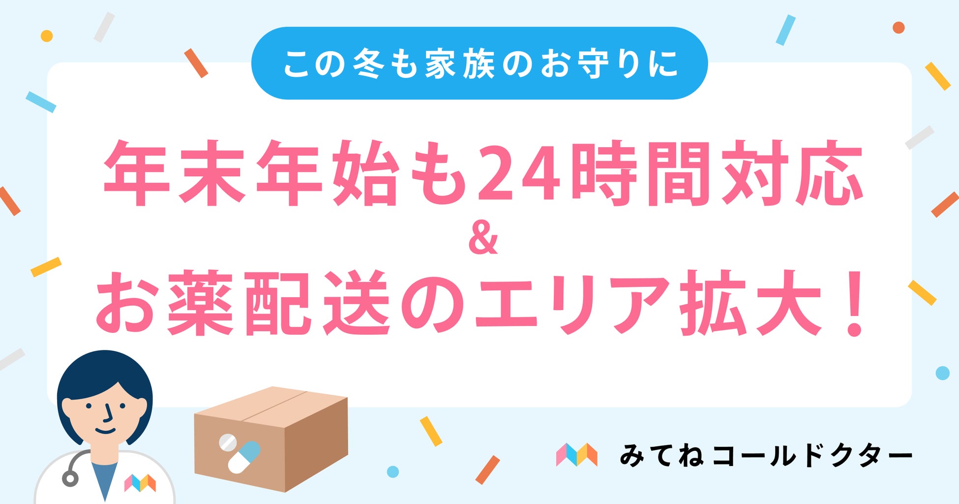 家族のためのオンライン診療アプリ「みてねコールドクター」を提供する株式会社コールドクター(東京都渋谷区、代表取締役社長:合田武広、以下コールドクター)は、年末年始も24時間の体制にてオンライン診療を提供いたします。また、年末年始は薬の配送エリアの臨時拡大と即日配送の受付時間延長を行います。
