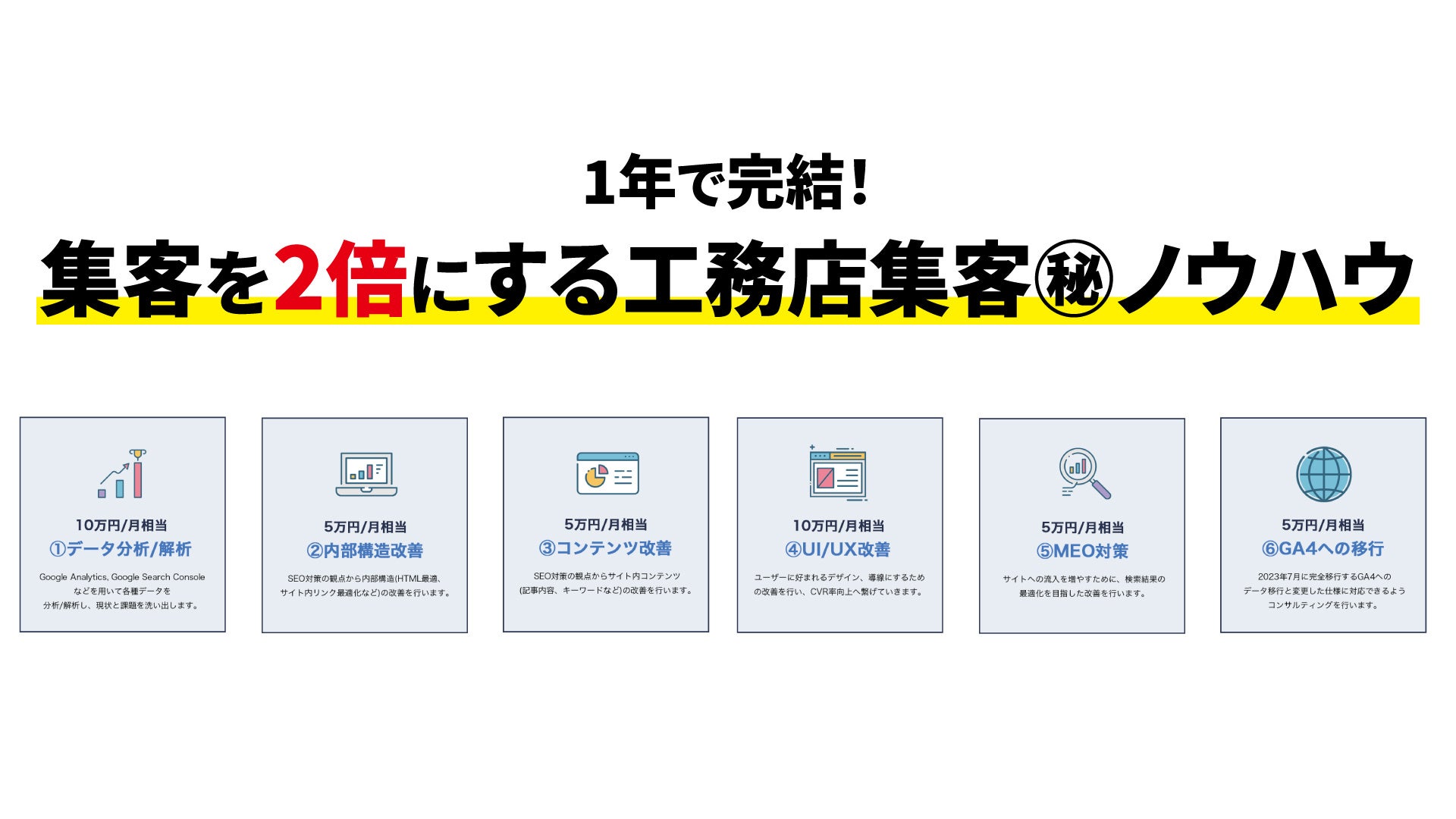 SEO対策をメインとした下記施策を通じて、Web集客の最大化を図ります。