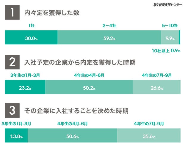 も10.8%に上りました。また、「4年生の4月-6月」に50.2%の学生が内定を獲得してお