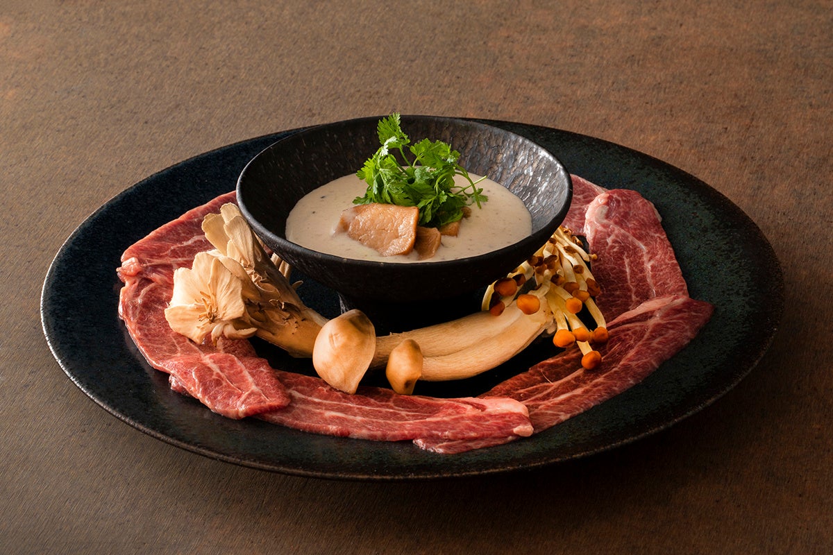 ポルチーニソースで食べる牛ツラミとキノコの盛合わせ