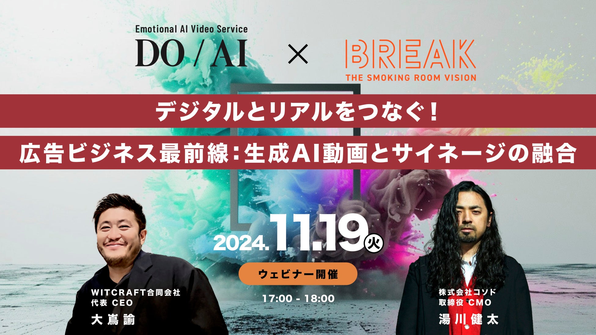 首都圏オフィスビル喫煙所サイネージメディア「BREAK」をニューステクノロジー社と共同で運営する株式会社コソド(本社:東京都千代田区、代表取締役CEO:山下悟郎)は、生成AIを活用した動画サービス「DO/AI(ドゥ・エーアイ)」を展開するWITCRAFT合同会社(本社:東京都品川区、代表CEO:大嶌諭)と共同で『デジタルとリアルをつなぐ!広告ビジネス最前線:生成AI動画とサイネージの融合』と題したオンライン無料セミナーを開催いたします。