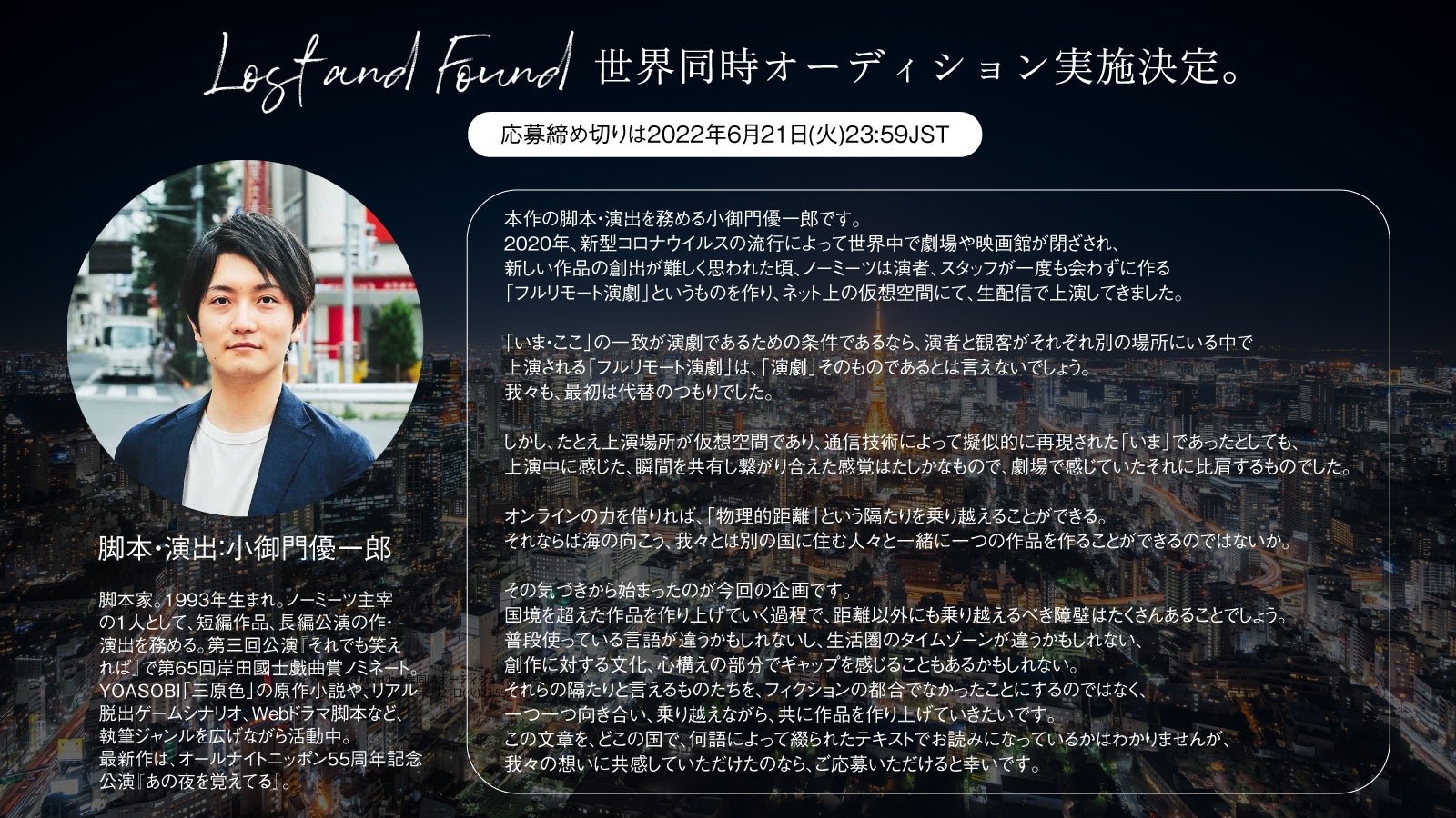 ストーリーレーベル「ノーミーツ」は2022年8月28日(日)に、実験公演として世界同時演劇『Lost and Found』を公演することを発表いたします。本公演は、2021年に第24回文化庁メディア芸術祭エンターテインメント部門の優秀賞をノーミーツが受賞した後、令和3年度メディア芸術クリエイター育成支援事業の「国内クリエイター創作支援プログラム」の支援を受けて制作された作品です。