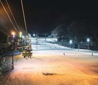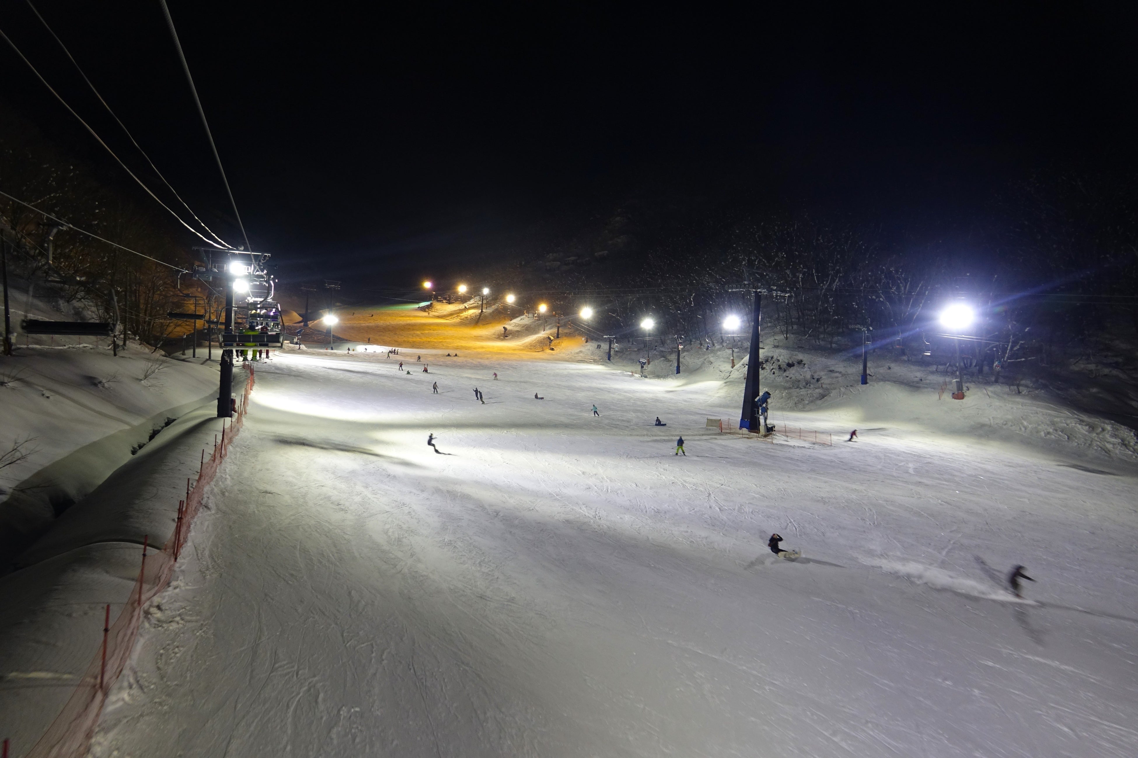 白馬では唯一のナイター営業。昼間営業終了後、閉鎖をして、荒れたゲレンデをきれいに整備してリニューアルオープン。ナイター照明と降雪機の稼働は100%再生可能エネルギー使用し環境負荷を減らしています。