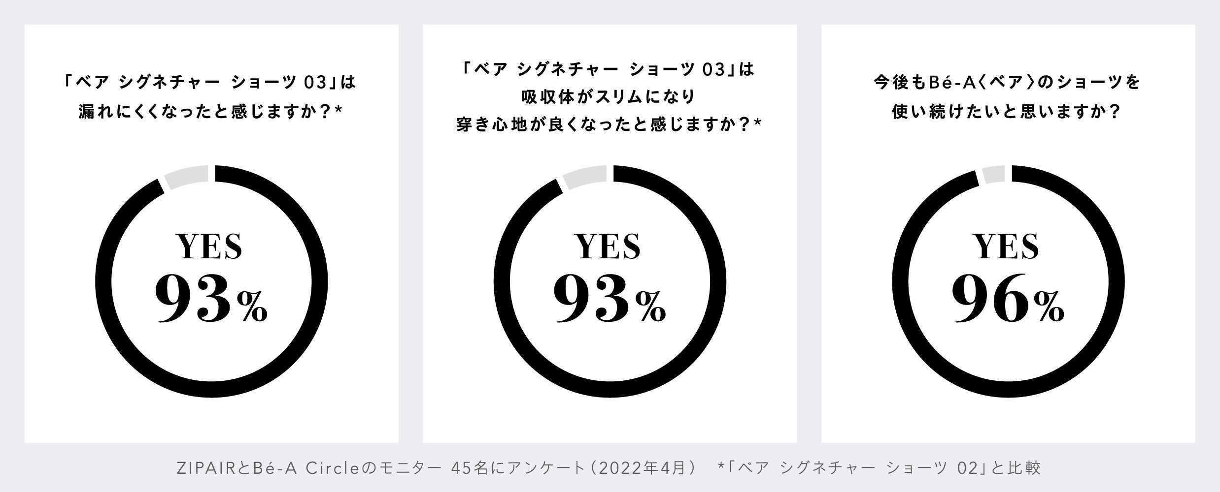 アンケートの結果*¹、「ベア シグネチャー ショーツ 03」を穿いてみた感想では96%の人が「満足だった」と回答し、さらに93%の人が従来モデルと比較して漏れにくさを感じるなど、吸収体の改良により、これまで以上に横漏れしにくく、吸水量がアップした性能を実際に体感いただくことができました。また、お尻部分の吸収体を薄型にすることで叶えた、より良い穿き心地の面でも93%が「穿き心地がよくなった」と回答。吸水力はもちろん、穿き心地の改善にも高い評価をいただき、96%の人が今後もBé-A〈ベア〉のショーツを使い続けたいと回答しました。