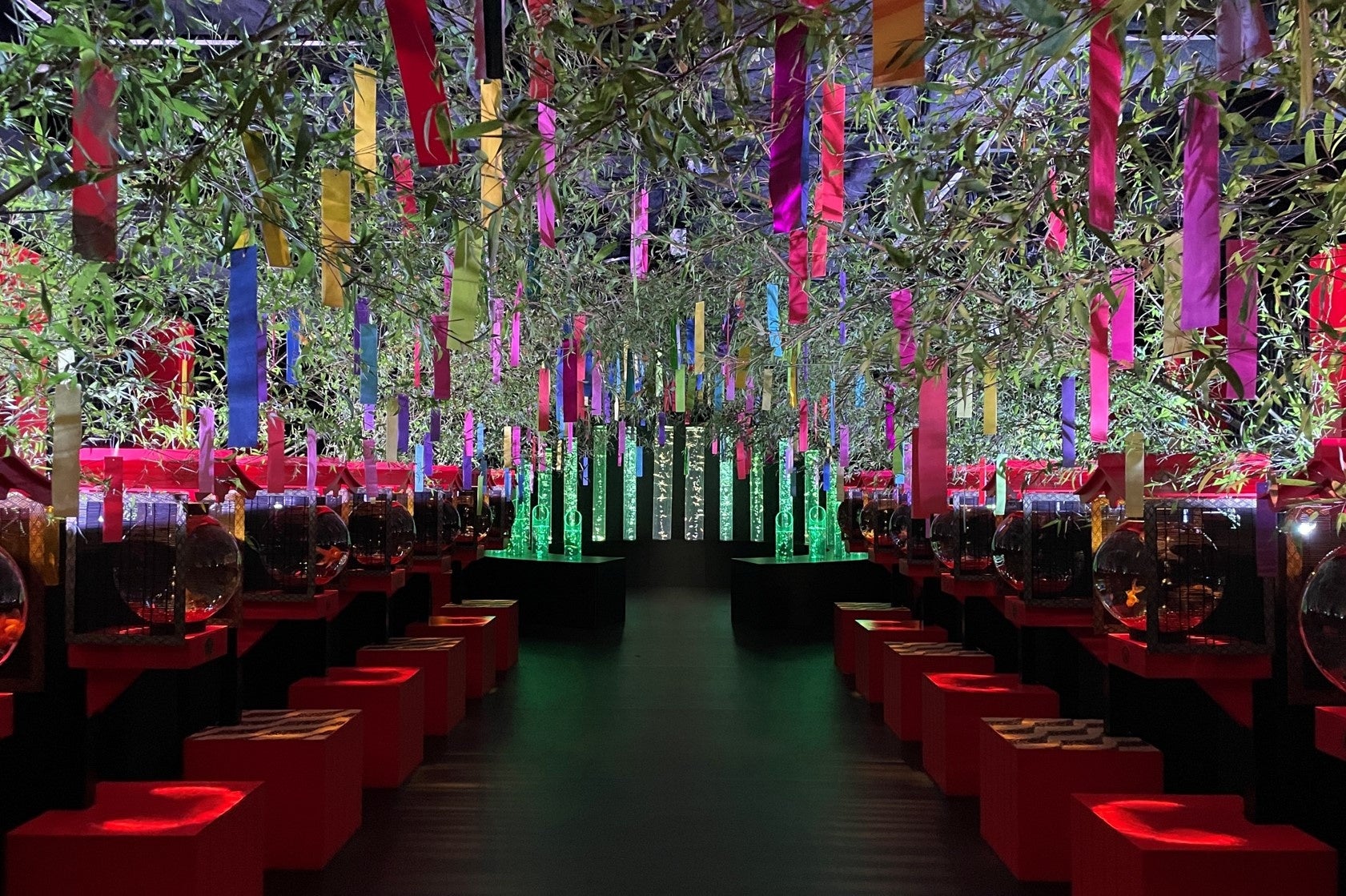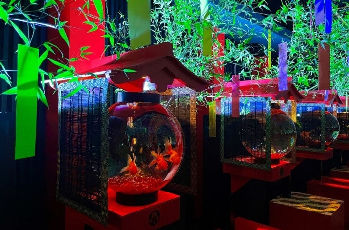 夏の風物詩「金魚」と、「七夕」の象徴である笹に飾られた短冊を華やかなライティングで演出。