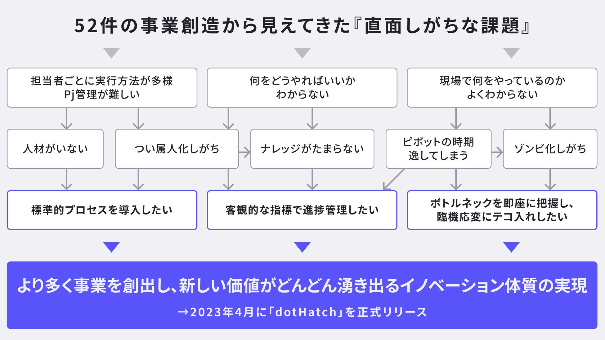 dotDは、自社事業・共創事業合わせて4年で52件もの事業づくりに携わってきました。そしてこれまでの事業創造を通じて事業づくりの上で直面する”課題”の共通項が見受けられました。