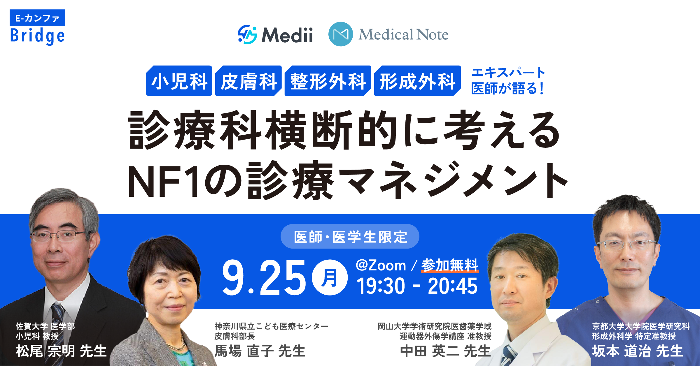 カフェ・オ・レ斑を特徴とする神経線維腫症1型(レックリングハウゼン病:NF1)は、皮膚、神経系、眼、骨等に多種病変が年齢の変化と共に出現し、全身に多彩な徴候を呈するために、様々な診療科で遭遇する可能性の多い疾患です。また、最近では、3歳以上18歳以下の外科的切除困難なNF1患者を対象とした治療薬が登場したものの、その適応の判断など診断後のフォローアップについて悩むことが多いのではないでしょうか。そこで、NF1に遭遇する可能性が高い小児科・皮膚科・整形外科・形成外科の4名のエキスパートが、実際の症例をもとにした合同カンファレンス形式でディスカッションし、各診療科の課題や視点をお伝えし、今後の診療マネジメントに生かせるセミナーを開催します。