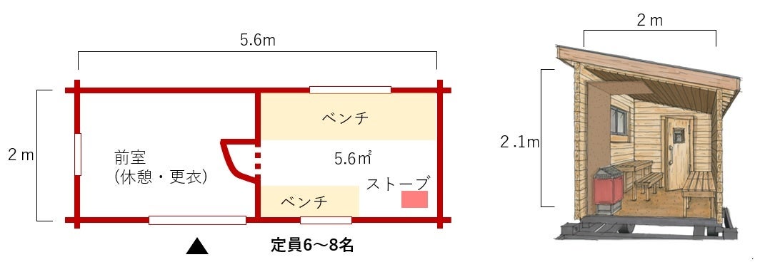 ・定員6~8名・フィンランド式のメトス社製電気式サウナヒーター使用で、ロウリュもでき安全で管理が容易(200Vでガソリン式発電機にも対応)