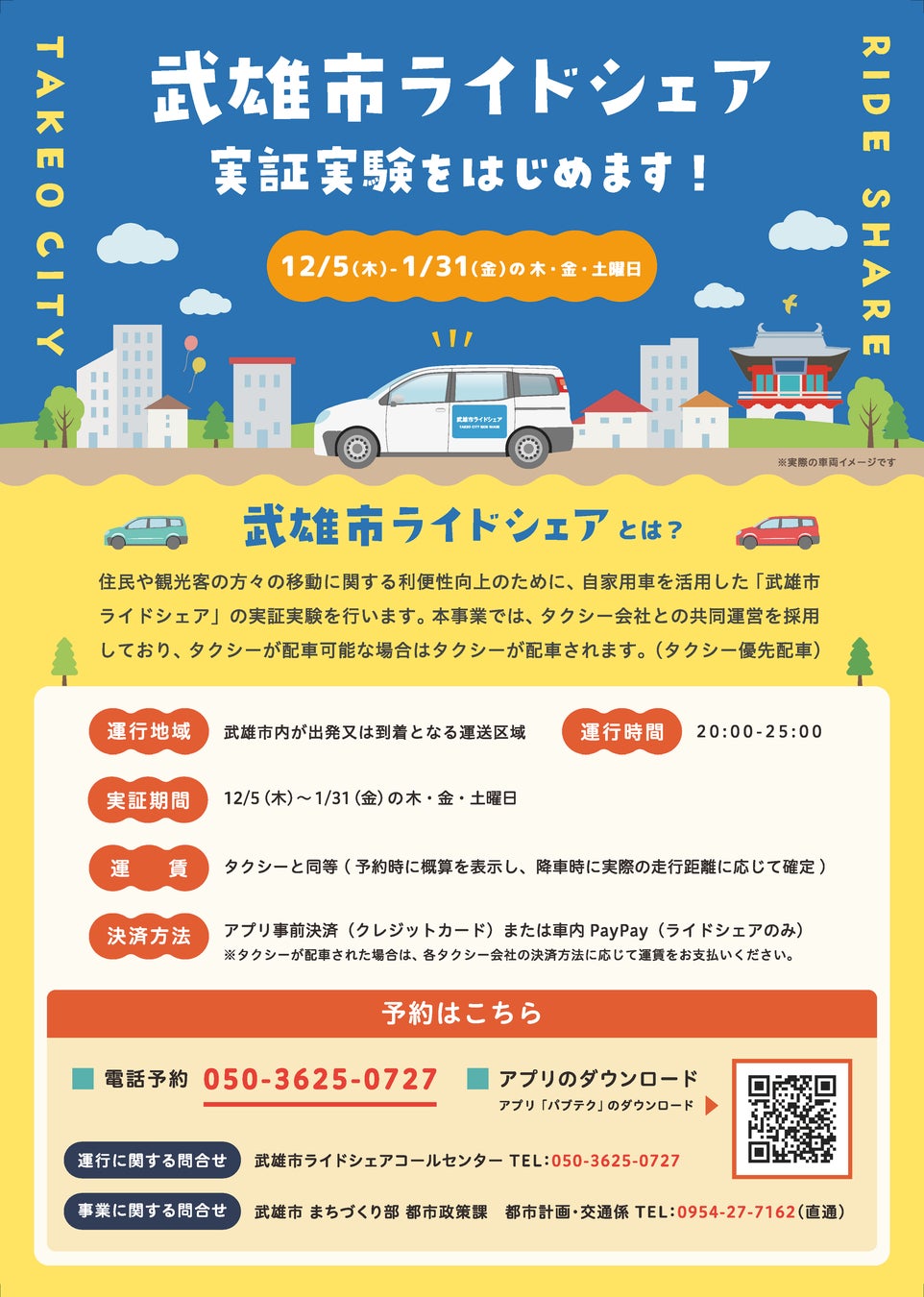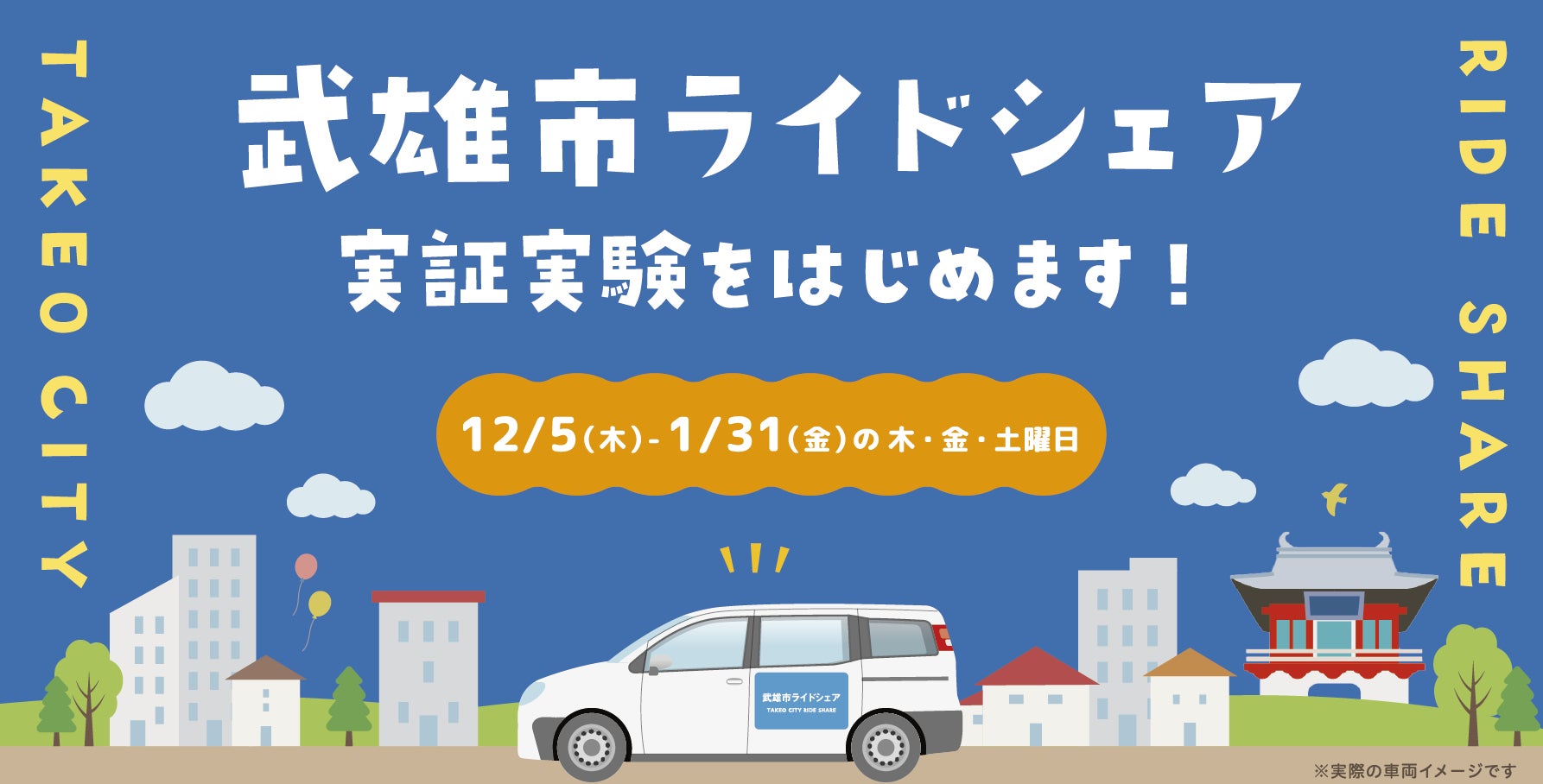 武雄市では、新たな公共交通の担い手として期待される一般ドライバーを活用した交通利便性の向上に取り組むため、12月5日(木)から2ヶ月間、「武雄市ライドシェア」の実証運行を実施します。パブリックテクノロジーズでは、石川県小松市が実施する「小松市ライドシェア」の運営実績が評価され、アプリ・システム、サービス全体の運営の両面から「武雄市ライドシェア」の実証運行を支援することとなりました。