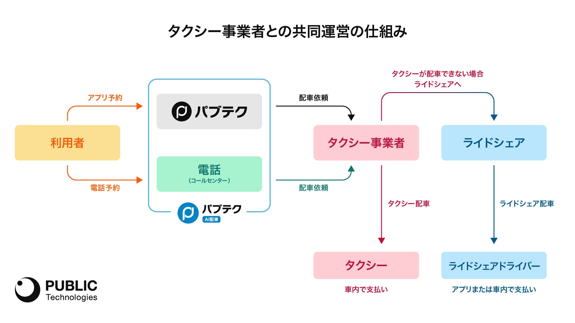 パブリックテクノロジーズは、「過疎地ライドシェア(※3)」と銘打ち、地域の交通インフラとしてのライドシェアサービスを提供することで、日本全国の交通空白地を繋ぎます。