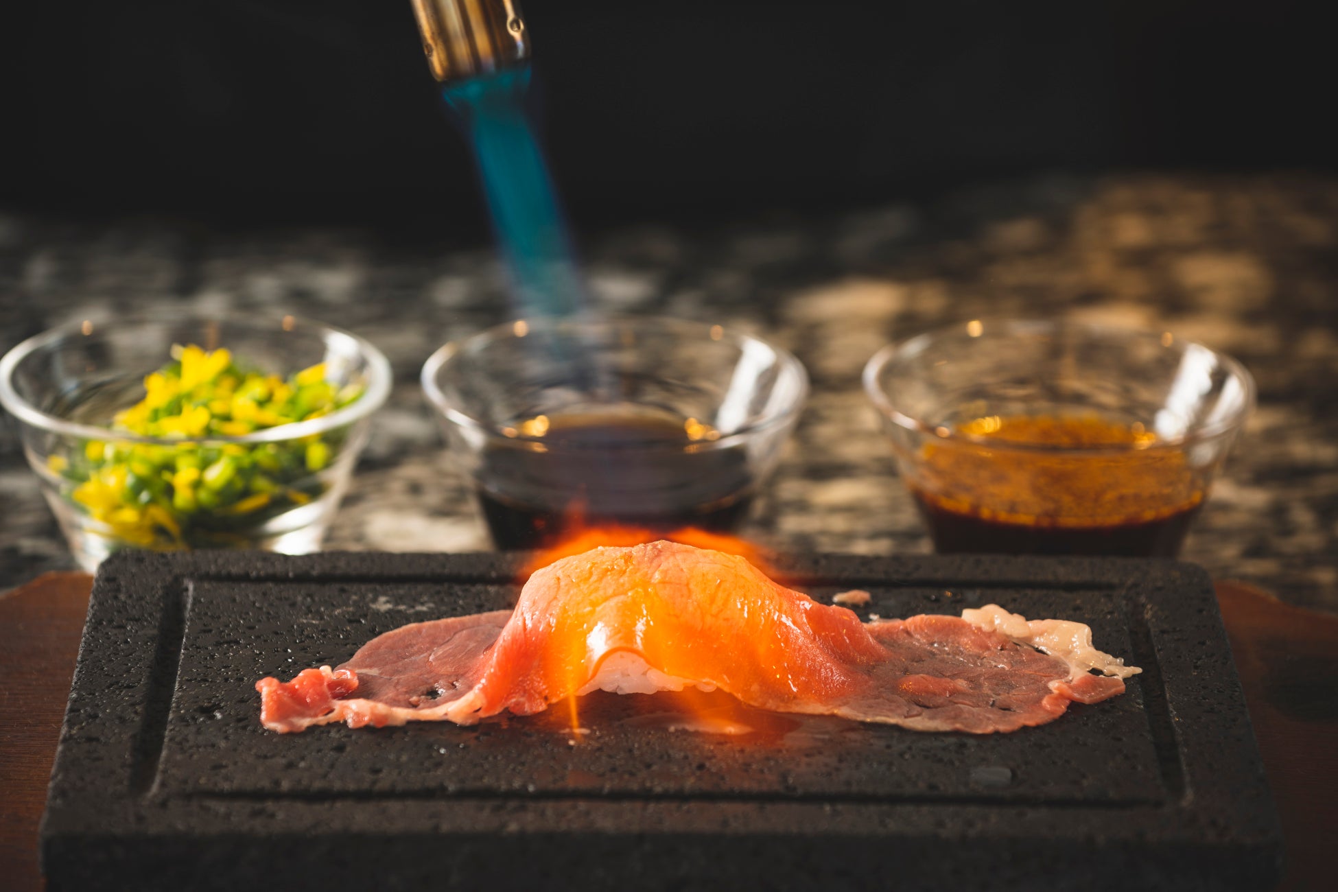 ビュッフェレストラン「スリユン」では、シグネチャーディッシュの、炙ることで際立つ肉の香ばしさが食欲をそそる「炙り牛寿司」や、数種類のスパイスが効いた「県産豚の火鍋しゃぶしゃぶ」を常にご用意しております。